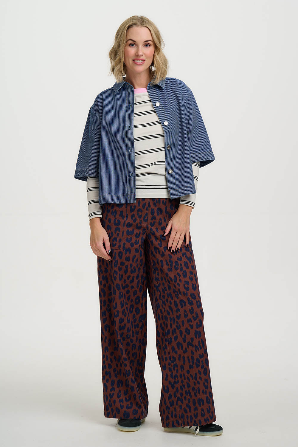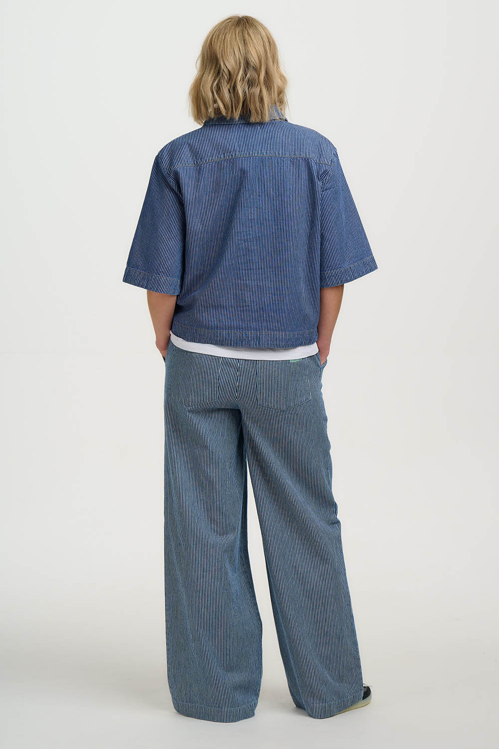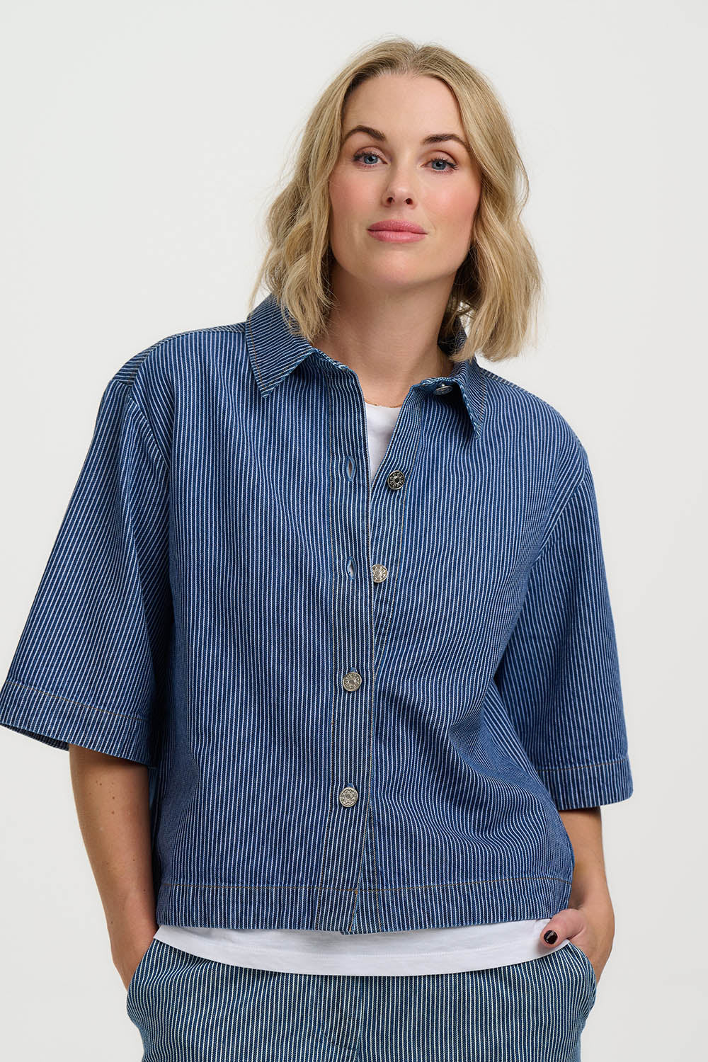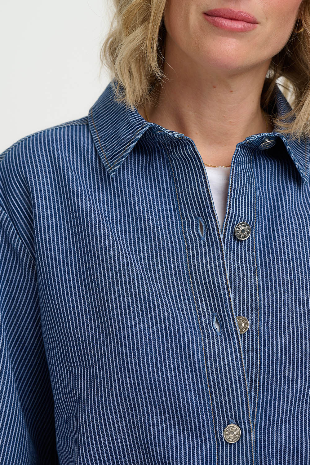 Jessie Juniper Sugarhill Brighton Amity Jacket in blue stripe. Denim-look top in soft, striped cotton. Shorter length in flattering wide cut. Features elbow length sleeve and star-embossed silver buttons.