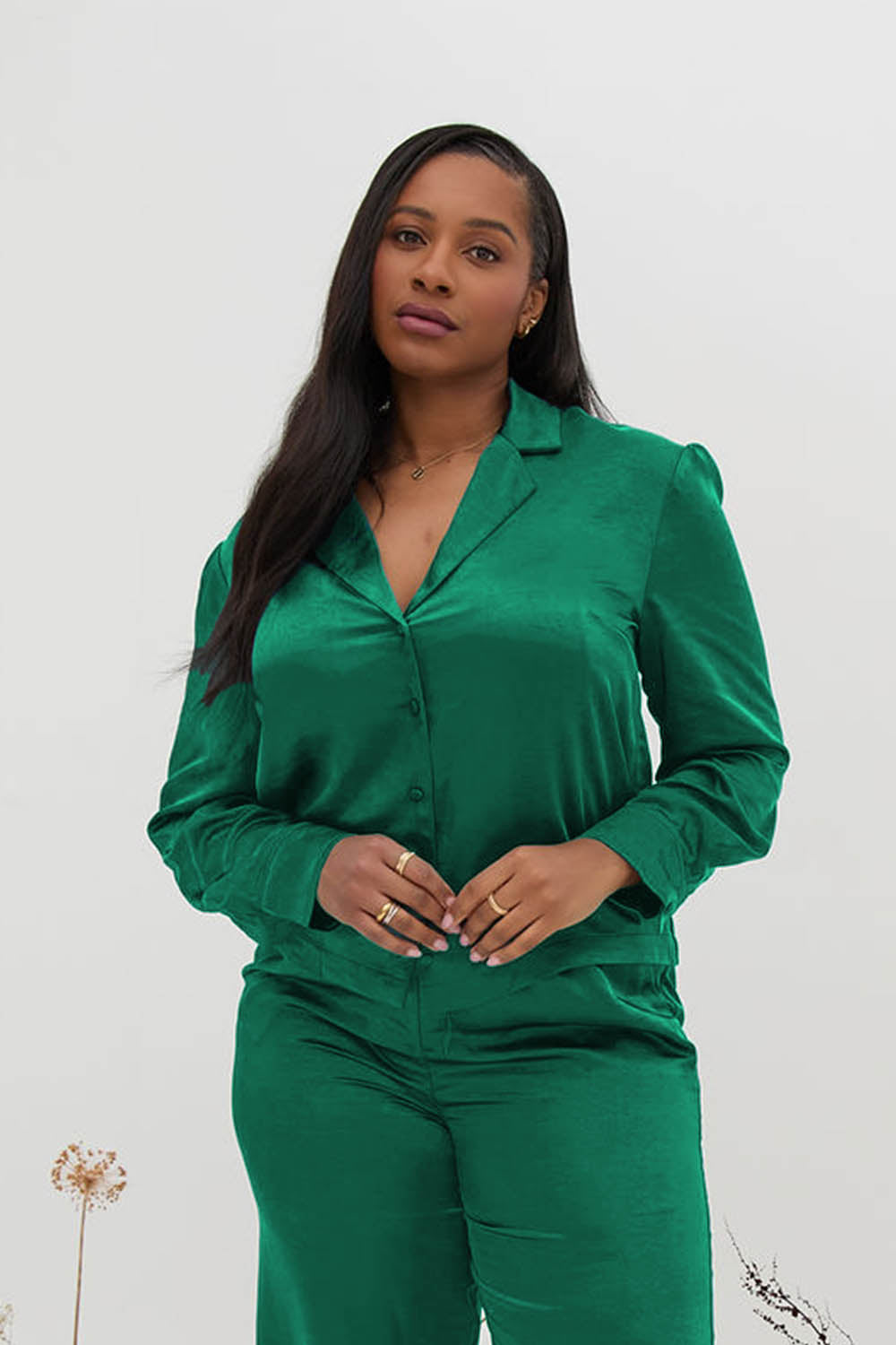 Jessie Juniper Fika blouse in emerald green. Open shirt collar. Covered buttons through. Full length sleeves with double button cuffs. Straight hem. Soft satin fabric.