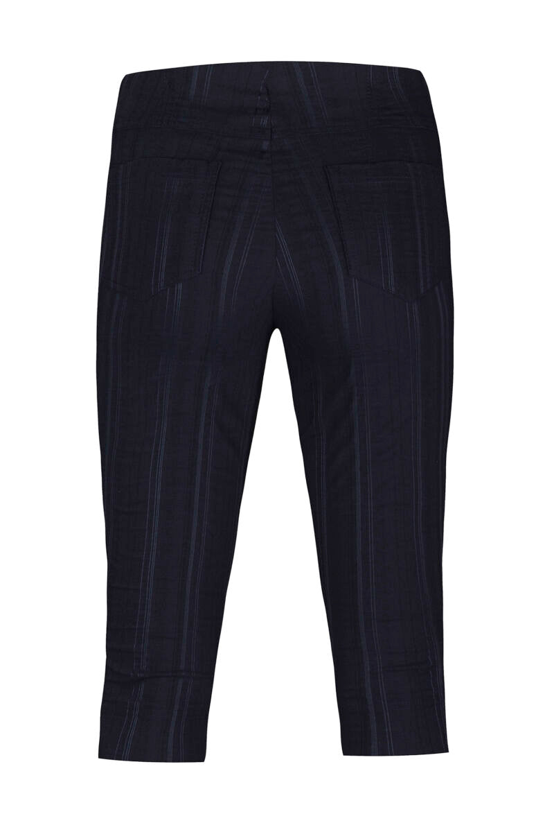 Jessie Juniper Robell seersucker style trousers in dark navy blue. High rise, elasticated pull on style. False front pockets and fly. Patch pockets on rear. Peddle pusher length with side split and diamanté detail. Pull on below knee short length trousers, perfect for holidays or golf. Wear with a bright or contrasting colour and sandals for a smart summer look.