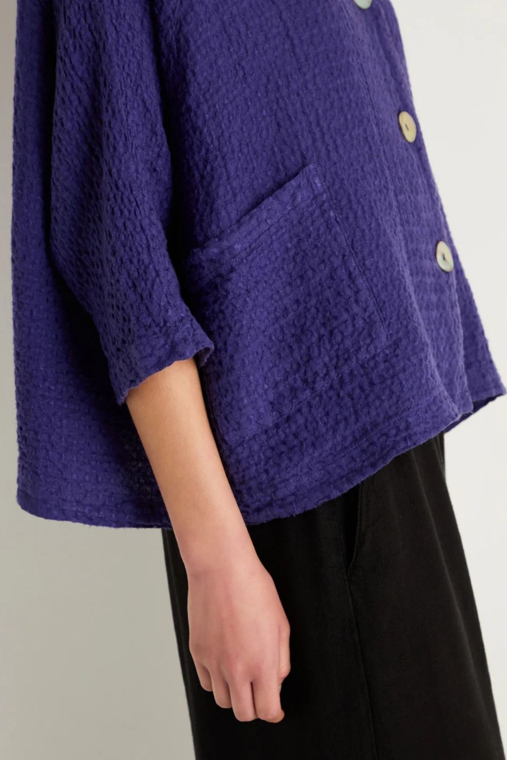 Jessie Juniper Sahara jacket in cream and in purple. Waffle linen fabric. Low collar. 4 mother of pearl buttons to fasten. Front patch pockets. Loose style. 3/4 length sleeves.