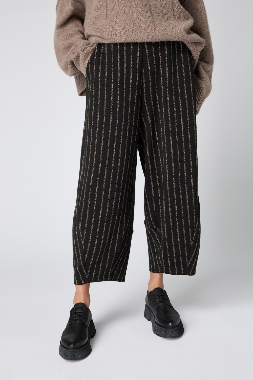 Jessie Juniper Broken Stripe Jersey Bubble Trousers. Soft, weighty jersey fabric in Sahara’s signature bubble cut. Cropped length. Pull-on style with elasticated back waist. Pockets. Super-comfy and flattering.