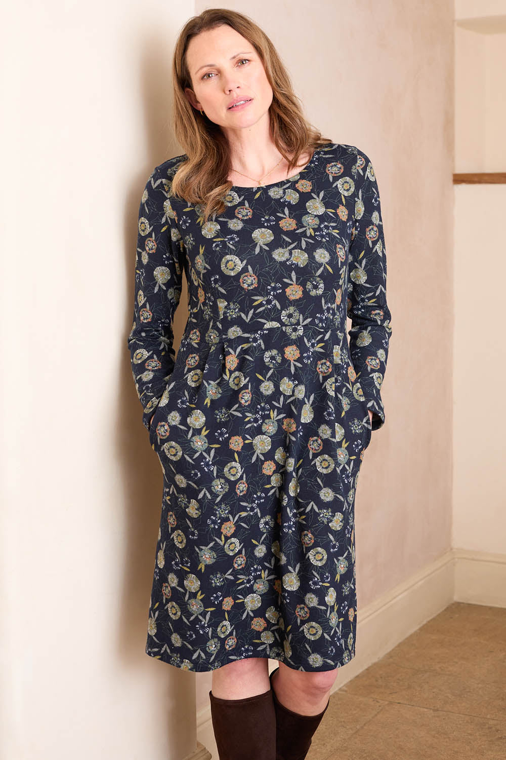 Jessie Juniper Lily & Me dress in recycled polyester fleece. Fitted style. Round neck. Full length sleeves. Pleats at waist. Side pockets. Navy blue with a floral print in green, yellow and orange.