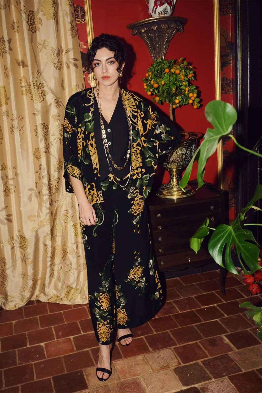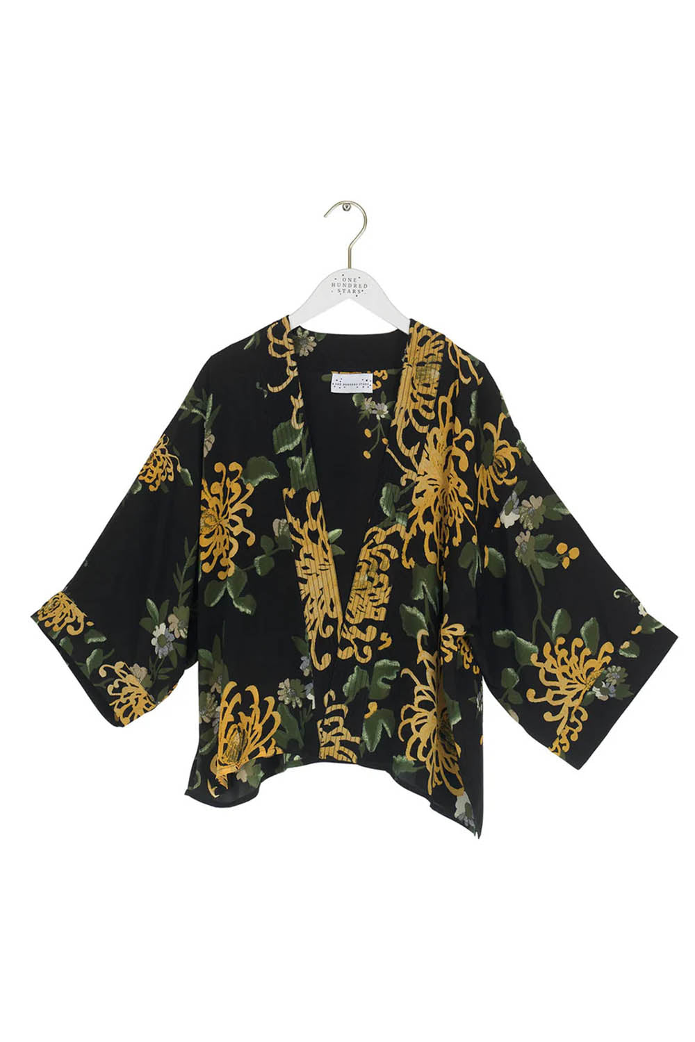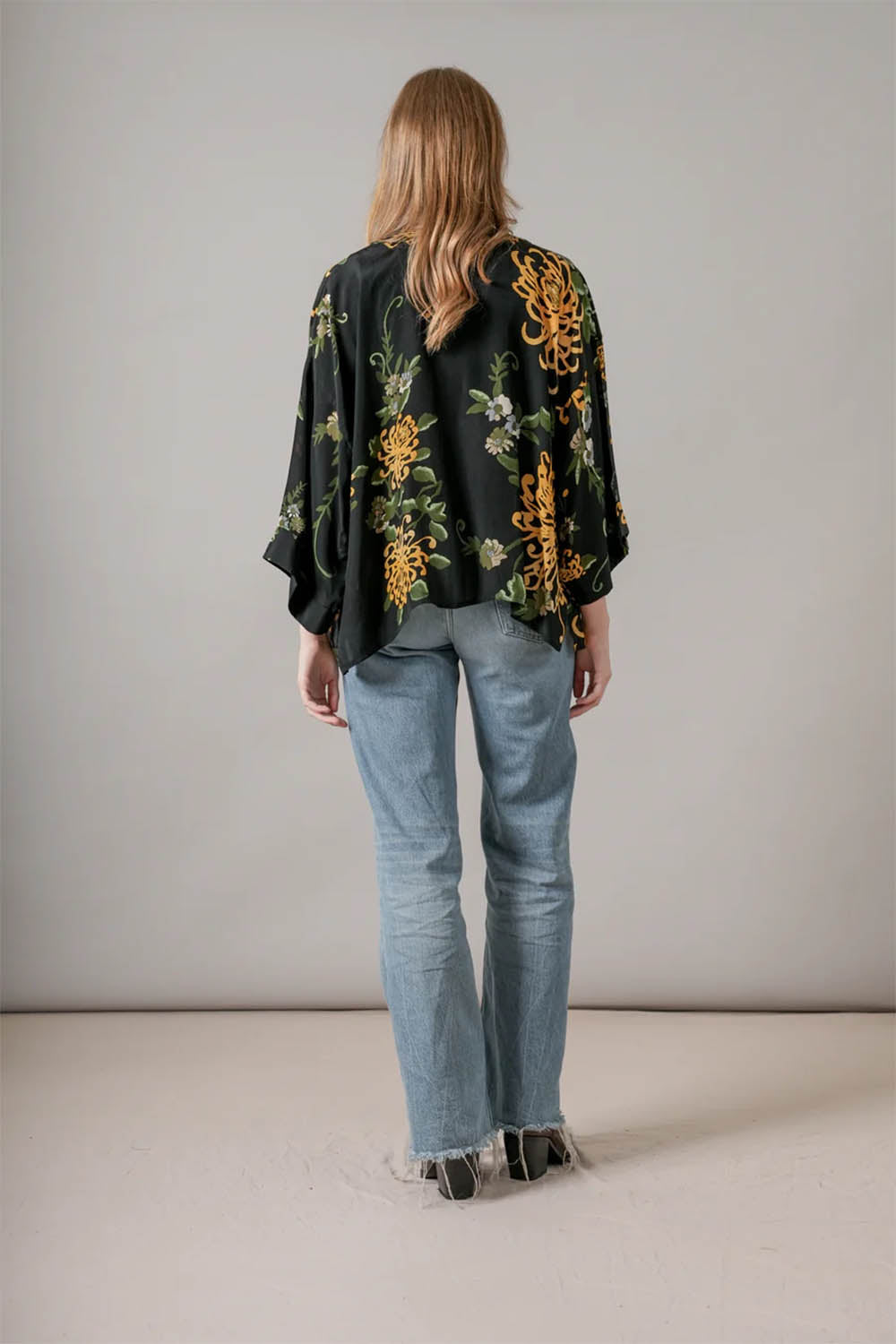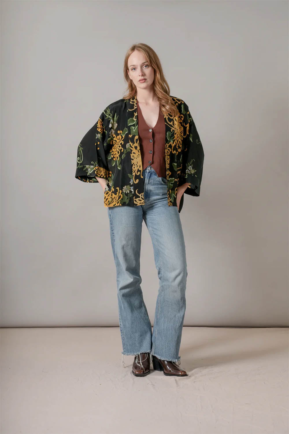 Our bestselling kimono jackets have loose ¾ length sleeves, an open front and a lightly embroidered lapel. The crepe Kimono is a heavier weight than our classic kimono.