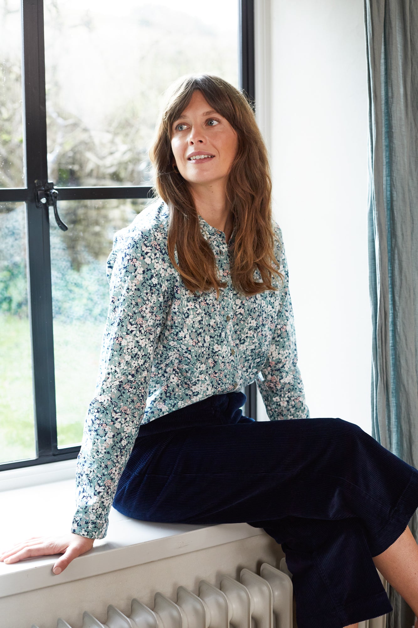 Pretty shirt in this lovely print. Wear with Lily and Me cord trousers or skirt in duck egg or navy blue. Wear with a cardigan o complete a tidy Autumn look.