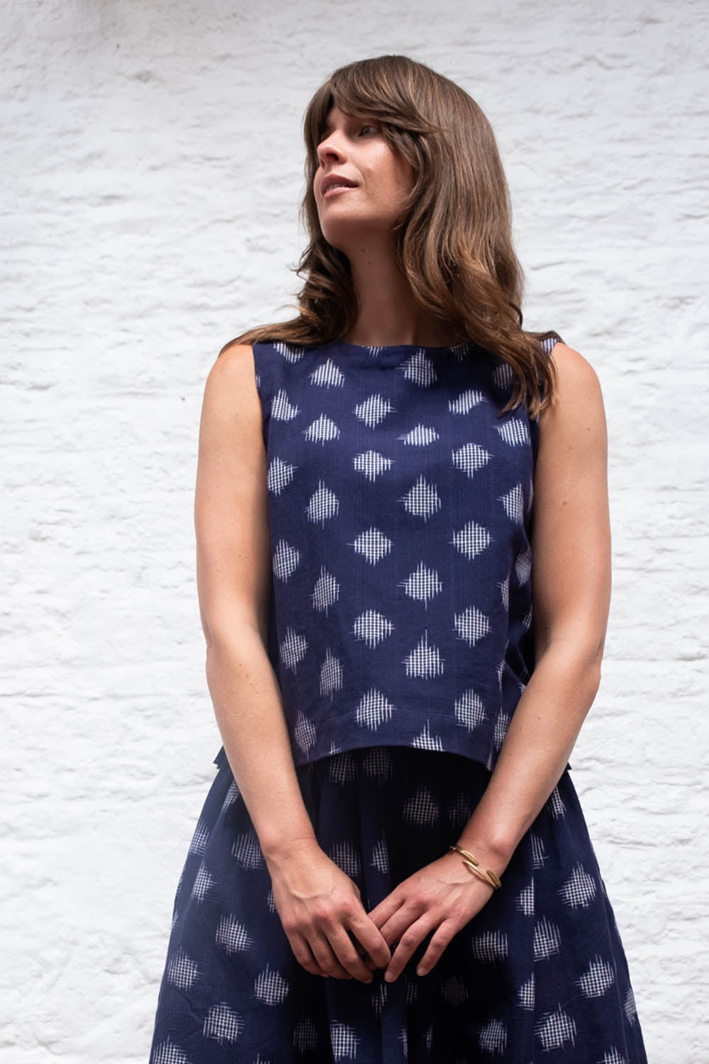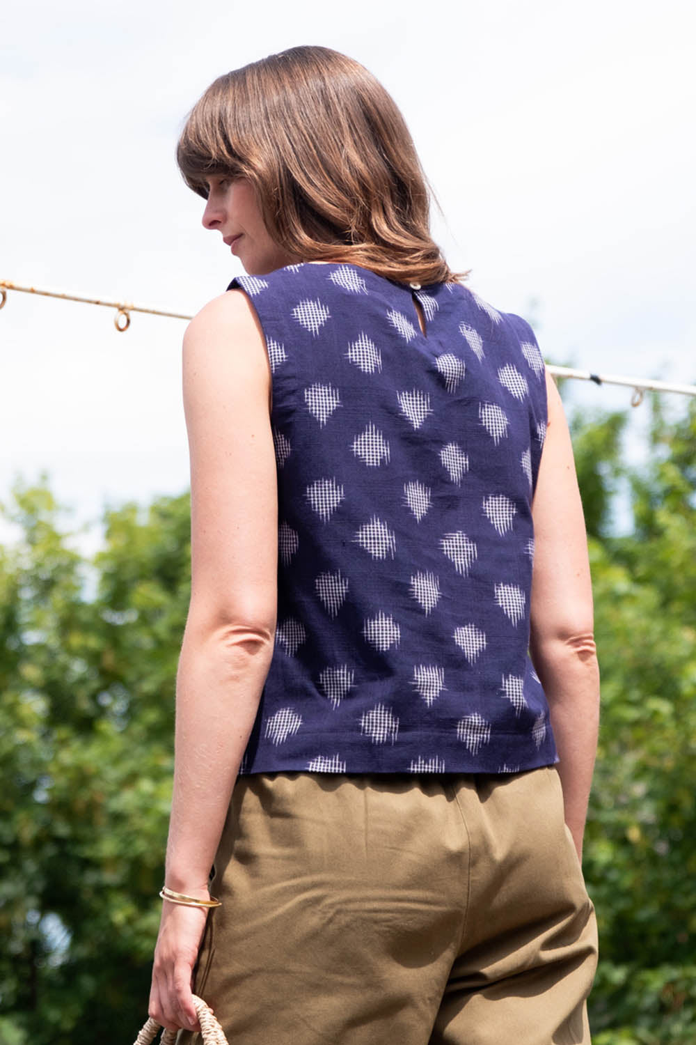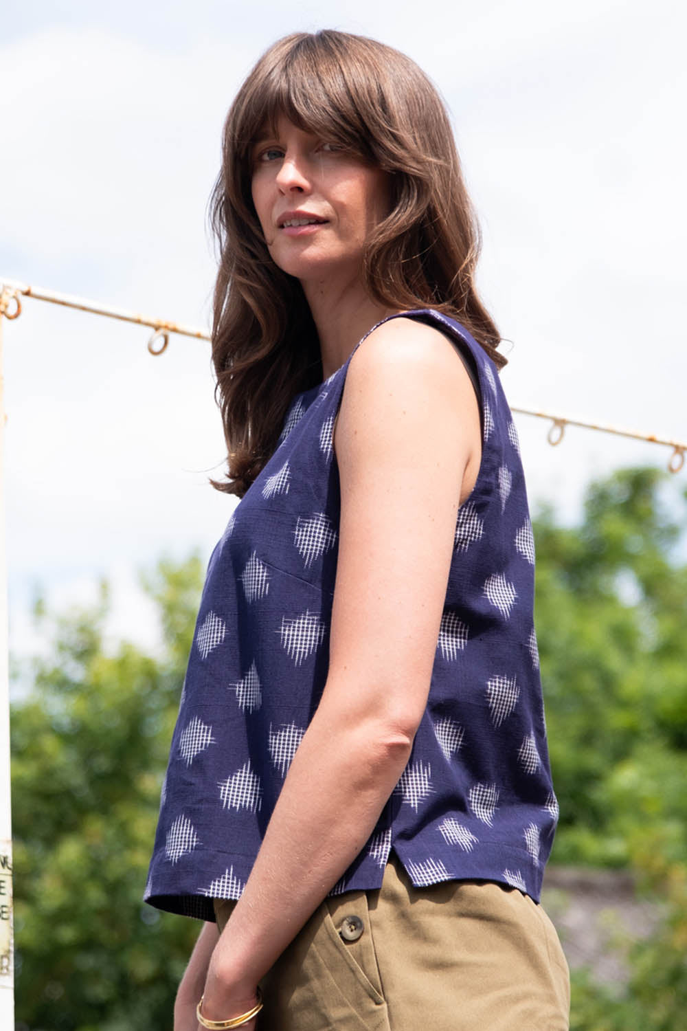 Jessie Juniper Bibico Cotton Pippa Blouse in ‘indigo square’. Sleeveless cotton top with back keyhole detail and mother-of-pearl button fastening. Wear with Bibico’s matching Jordan Casual Skirt in ‘indigo dot’ for the perfect summer co-ord look.