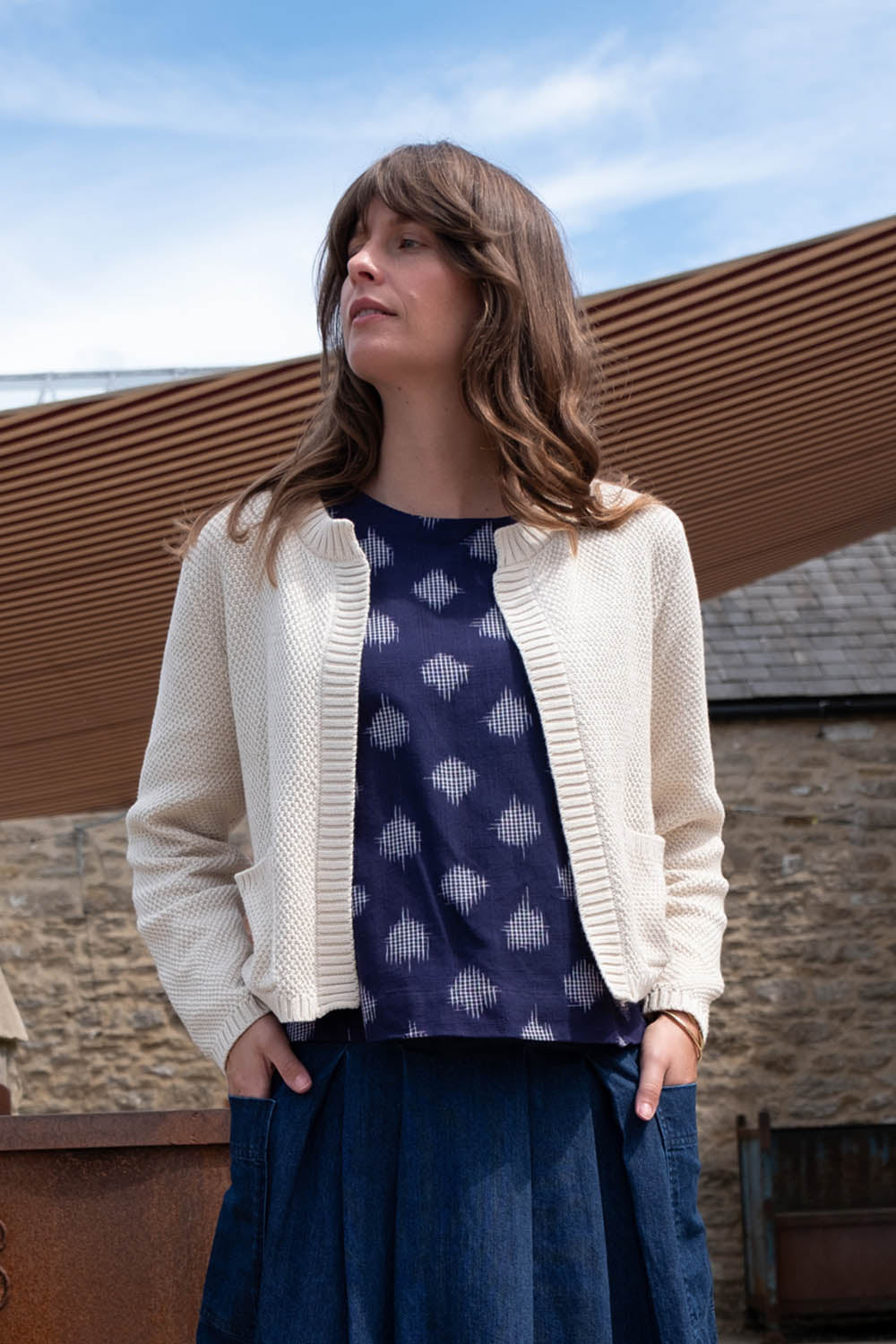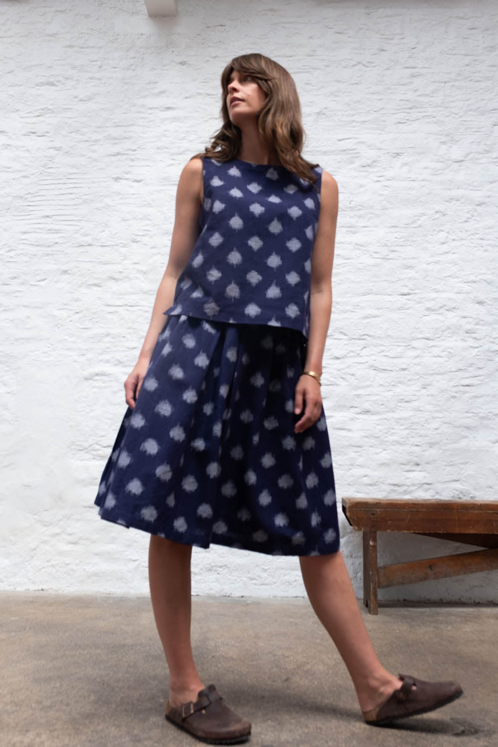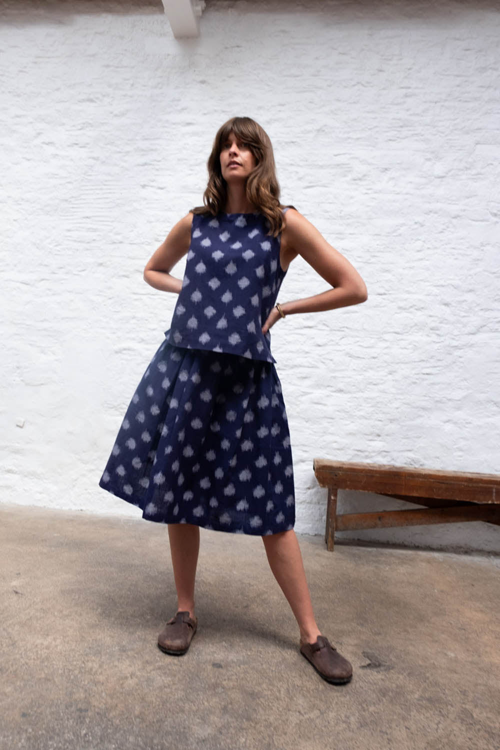 Jessie Juniper Bibico Cotton Pippa Blouse in ‘indigo square’. Sleeveless cotton top with back keyhole detail and mother-of-pearl button fastening. Wear with Bibico’s matching Jordan Casual Skirt in ‘indigo dot’ for the perfect summer co-ord look.