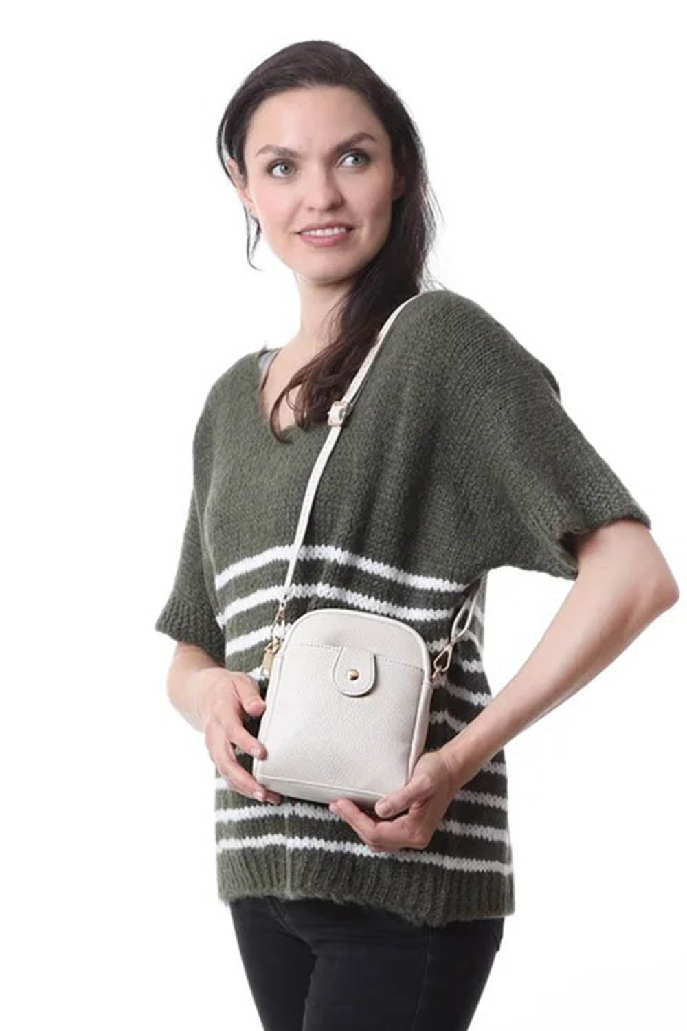 Jessie Juniper Kris Ana bag in cream and black. Brass zips and popper. Loops to attach strap. 3 pockets with a zip pocket and simple pocket within.