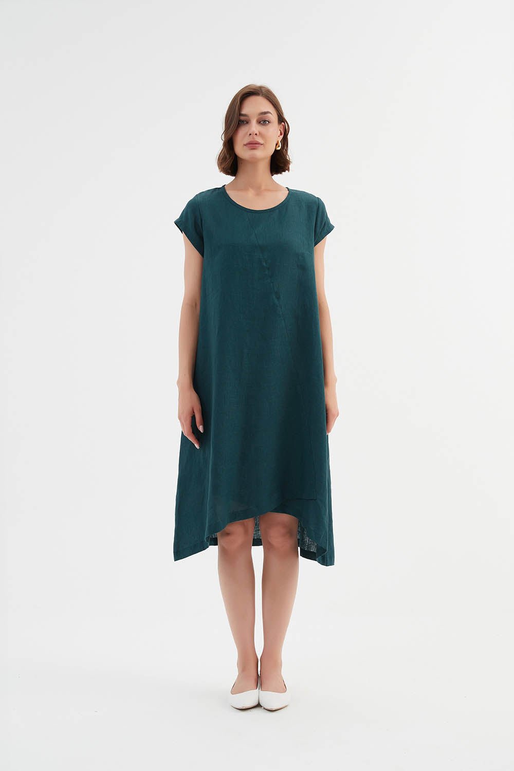 Jessie Juniper Tirelli Cross Front Detail Dress in ‘deep marine’. Mid length linen dress in relaxed, A-line cut. Features cap sleeve, concealed pockets to side seams, and diagonal front seam with asymmetrical cross-over detail to bottom hem.