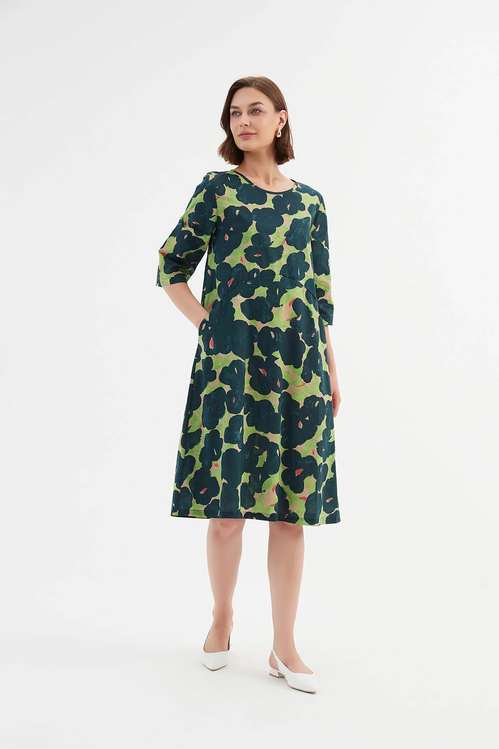 Jessie Juniper Tirelli Curve Seam Poplin Dress in ‘forest bloom’. Beautiful mid length cotton poplin dress. Features three-quarter length sleeve, curved seam detail to waistband with integrated pockets, and part elasticated back waistband.