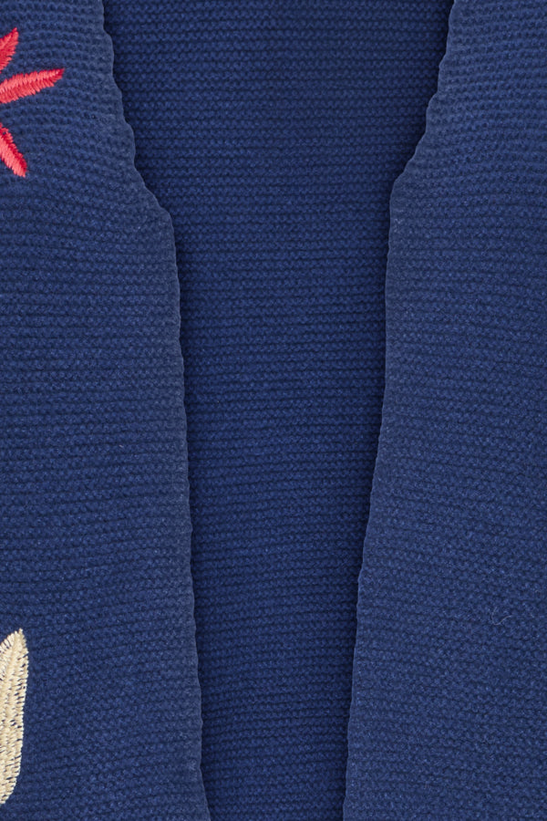 Jessie Juniper Ichi waistcoat in a garter stitch knitted cotton blend. Royal blue knit with a pink flower, a green leaf and a cream plant embroidered on. V neckline. Ribbing around armholes.