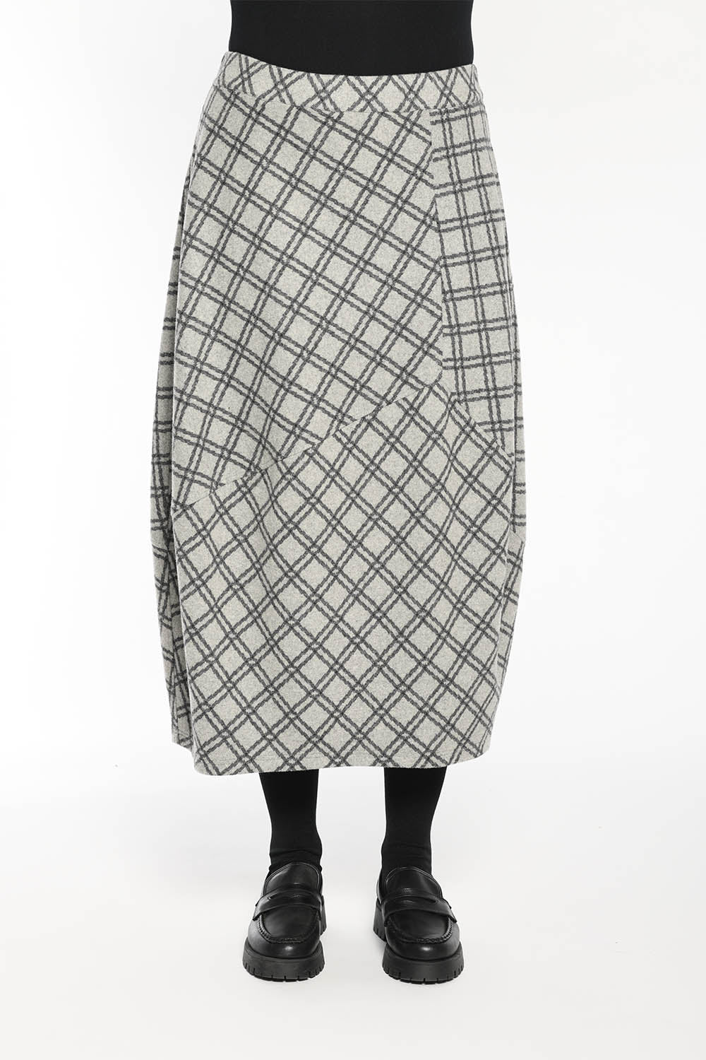 Jessie Juniper Vetono skirt in light grey with a dark grey grid check. Bubble style. Elasticated waistband. Side pockets. Seam detail down the front and bisecting the sides. Soft cotton fleece fabric with stretch.