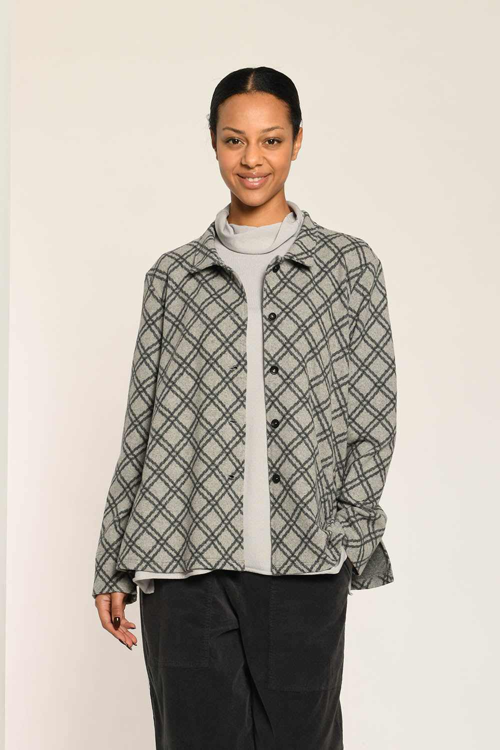 Jessie Juniper Vetono jacket in light grey with a dark grey grid check. Collar with 5 buttons to fasten through. Full length set in sleeves with split in cuff. Swing style. Side splits from hem. Side pockets. Soft cotton fleece fabric.