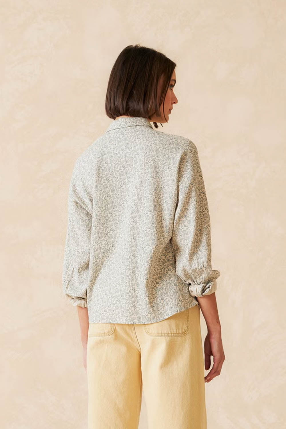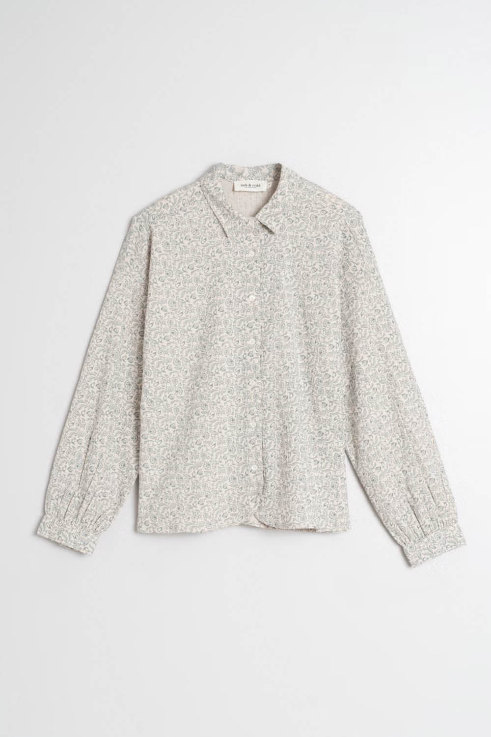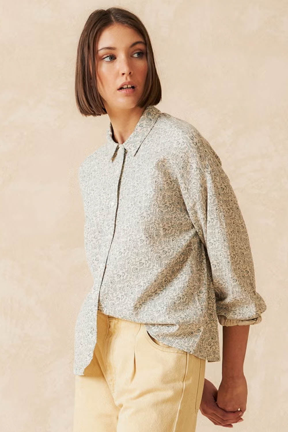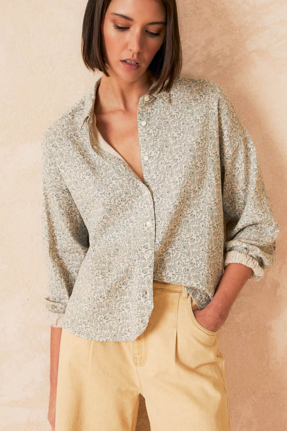 Jessie Juniper Indi&Cold shirt in cream with a delicate drawn floral print in teal. Shirt collar. Buttons through. Full length sleeves with button cuffs. Shaped opening. Woven organic cotton.