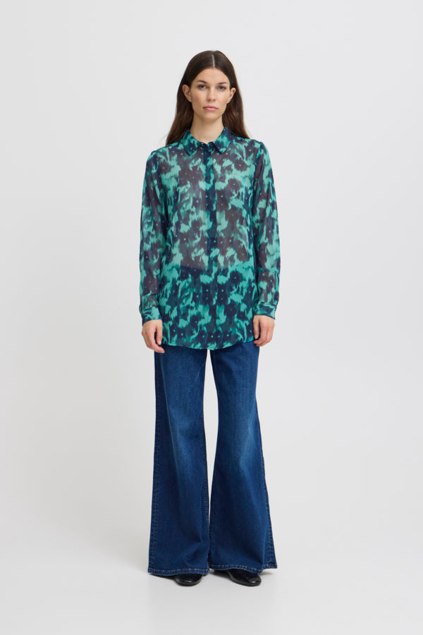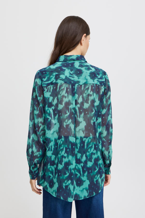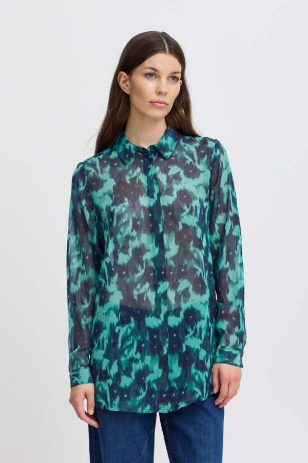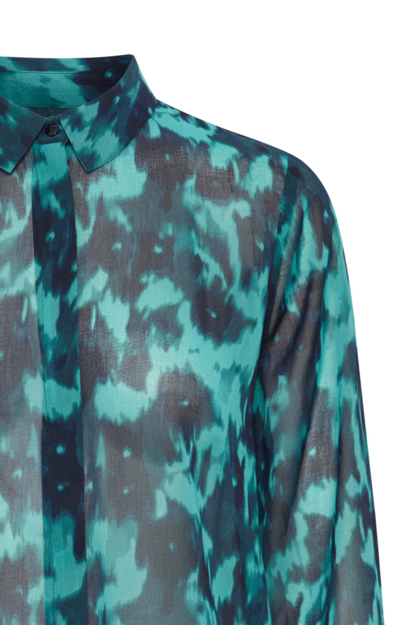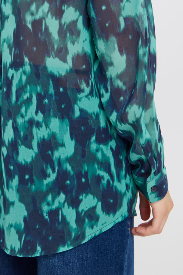 Jessie Juniper Ichi blouse in shades of blue. Fine voile fabric. Random print in navy and aqua. Shirt collar with placket covered buttons. Full length sleeves with button cuff. Inverted pleat on back.