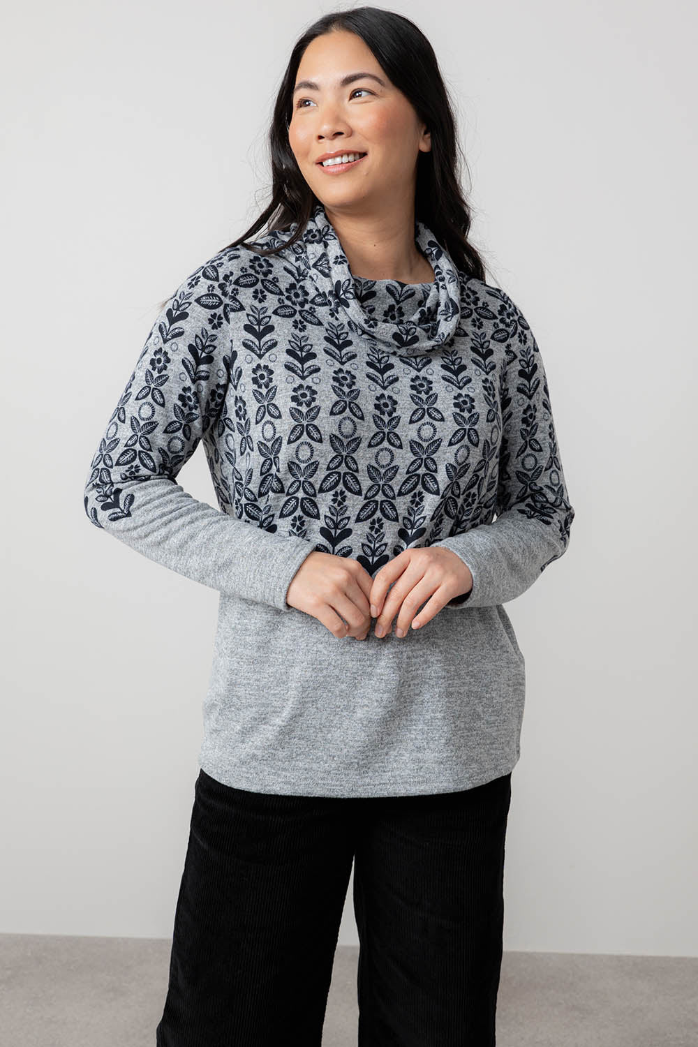 Jessie Juniper Lily & Me top in a fair isle print. Fleece fabric. Cowl neck. Full length sleeves. Straight style.
