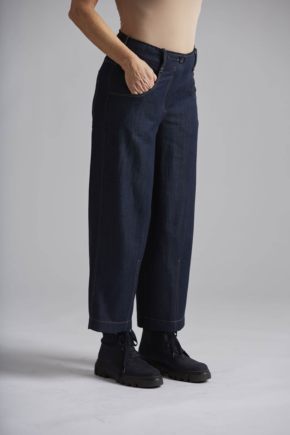 Jessie Juniper Yellow Label Front Dart 2596 Culottes, available in ‘night’. High waisted, wide leg trouser, tapered slightly at the ankle, in soft, chambray-style denim. Pockets to front and back, and contrast top stitching. Wear with any of Yellow Label’s chunky knit jumpers for the perfect autumn/winter look.