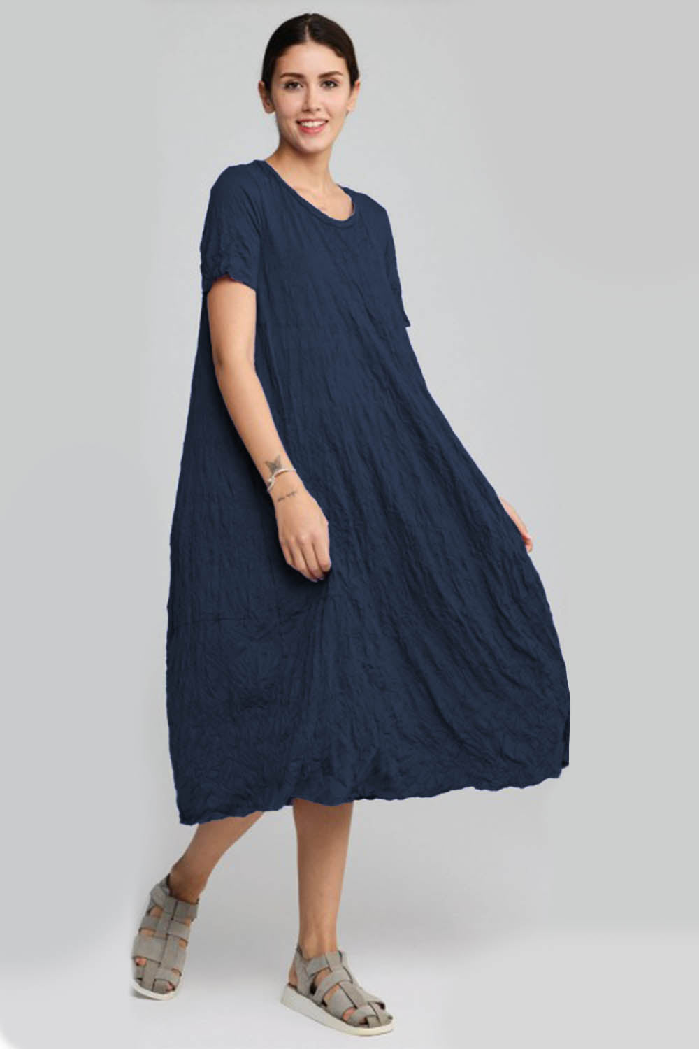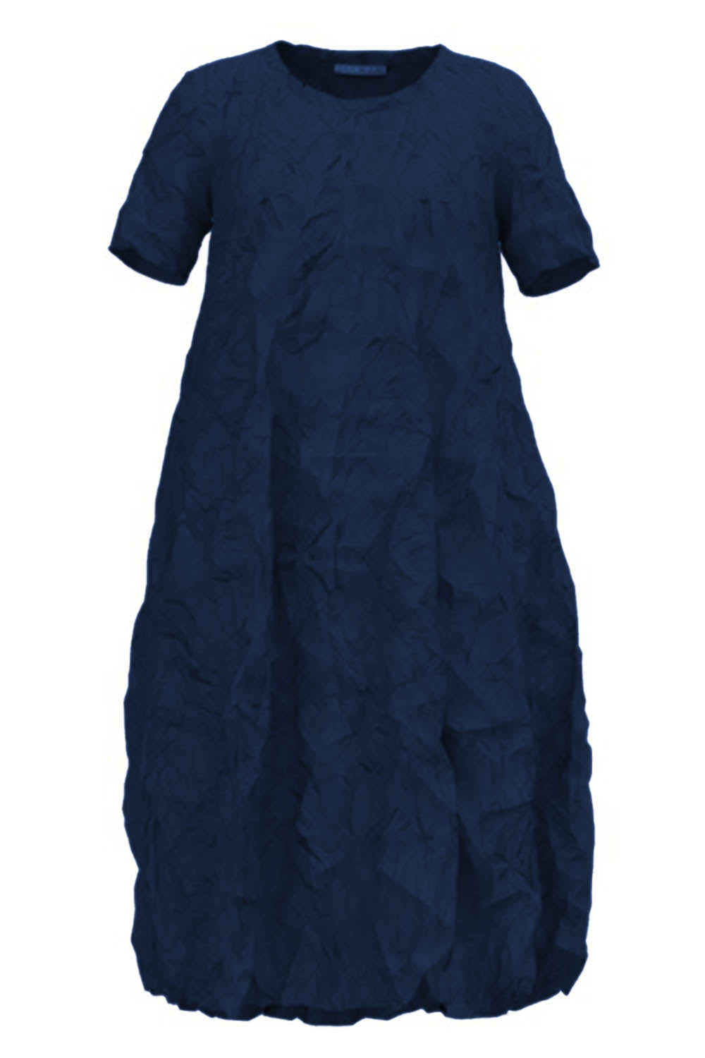 Jessie Juniper Luukaa Fusion Wrinkled Jersey Dress in ‘navy’. Stunningly simple dress in crinkle jersey fabric. Flattering A-line, slightly tulip cut shape. Short sleeve. Concealed pockets to side seams. The timeless, stylish design will make this a wardrobe staple for seasons to come.