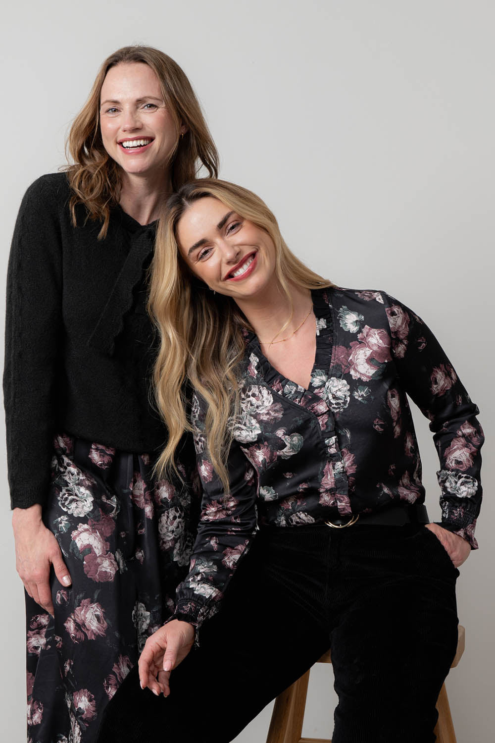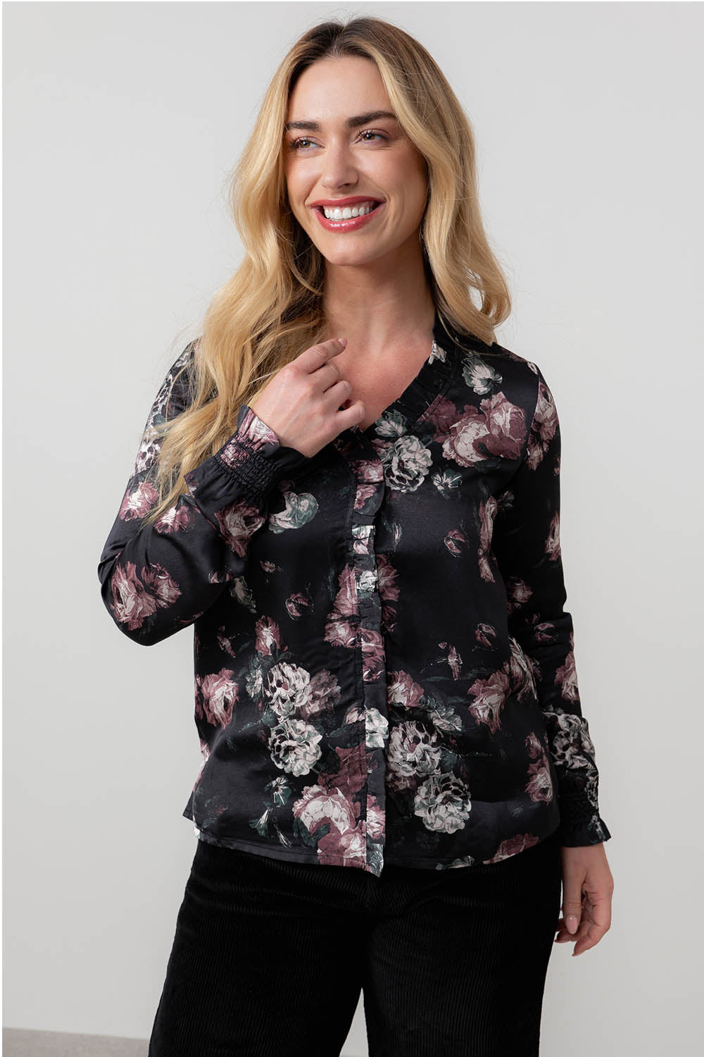 Jessie Juniper Lily & Me blouse in black with a floral print in green, pink and grey. Silky soft fabric. V neck itch ruffle edge. Hidden buttons through. Full length sleeves with ruched cuff. Side splits from hem.