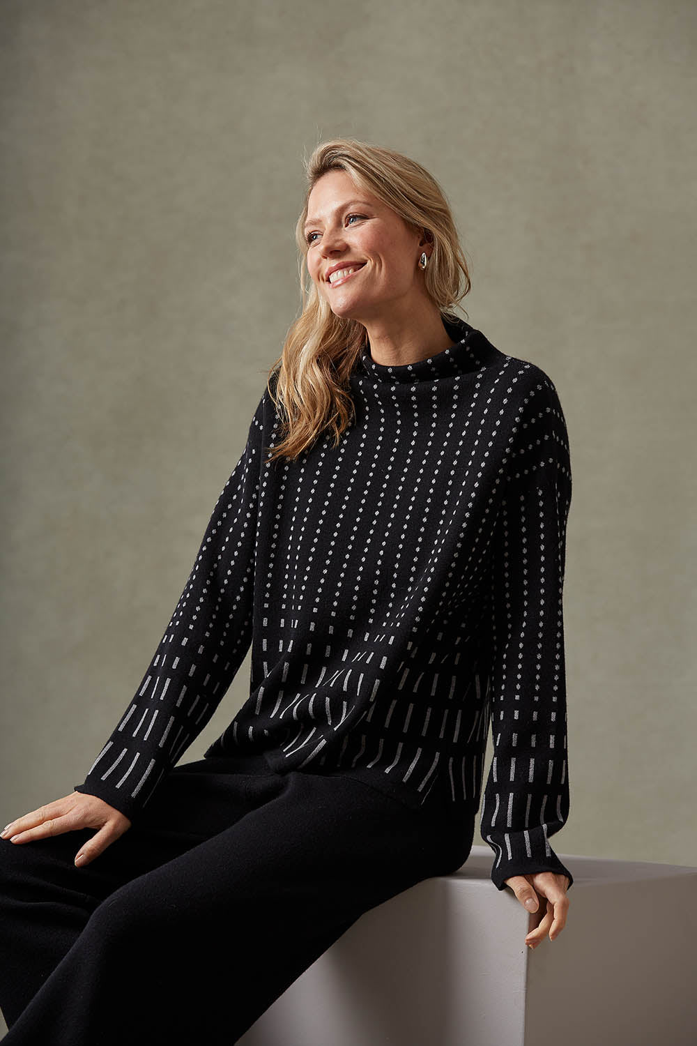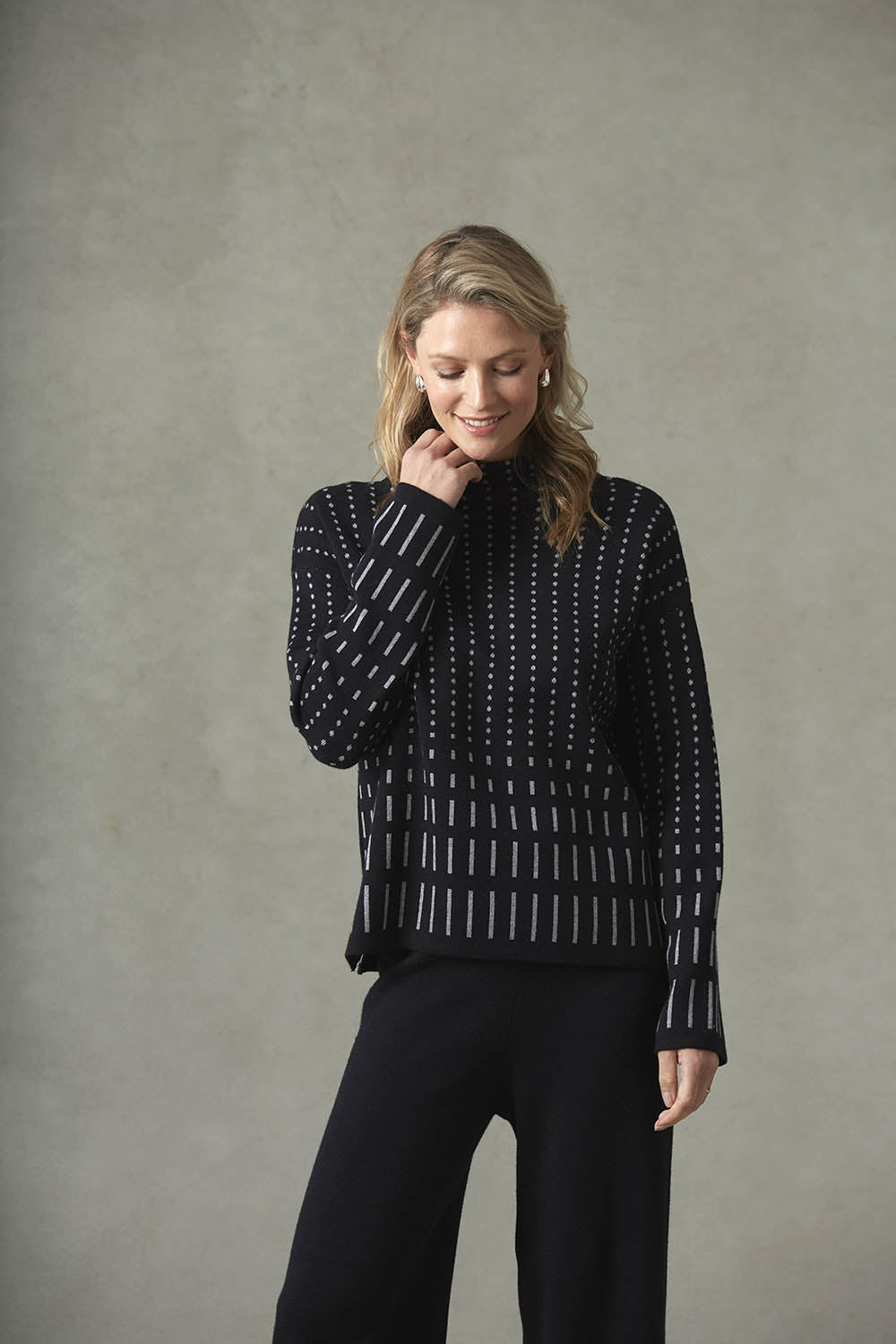 Jessie Juniper Yellow Label Jacquard Pins 2587 Sweater, available in black. Soft, weighty, viscose/polyester knit, with turtleneck, dropped shoulder seam and full length sleeve, and 5cm side vents. Wear with Yellow Label’s Slim Leg Turn Up 2593 Pants for the perfect smart/casual look.
