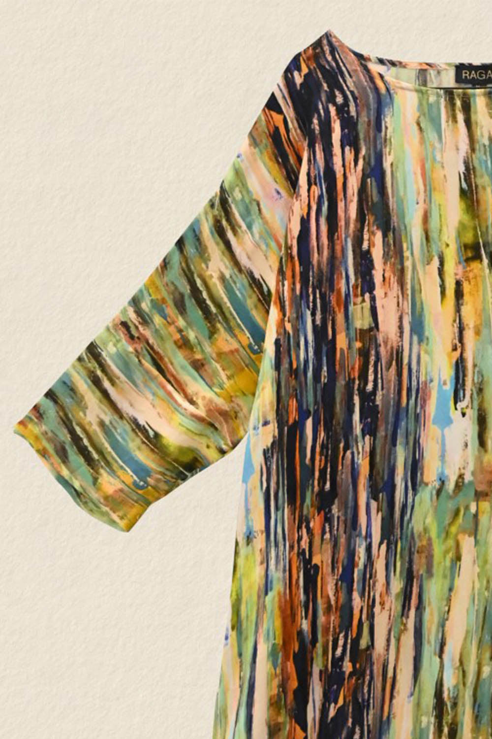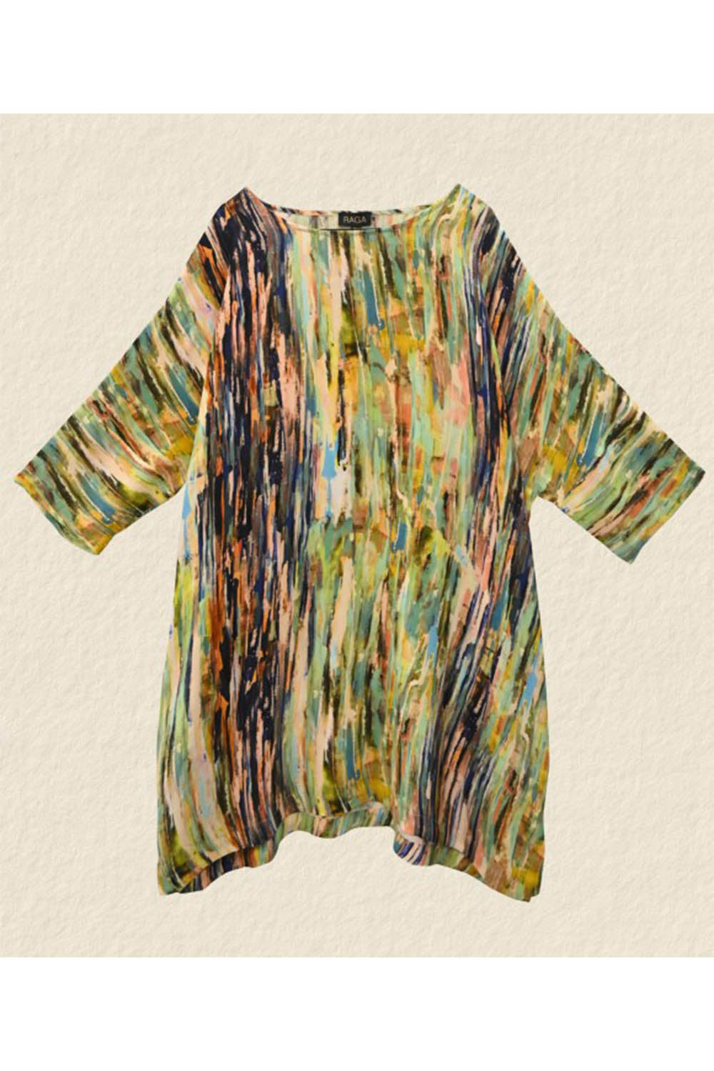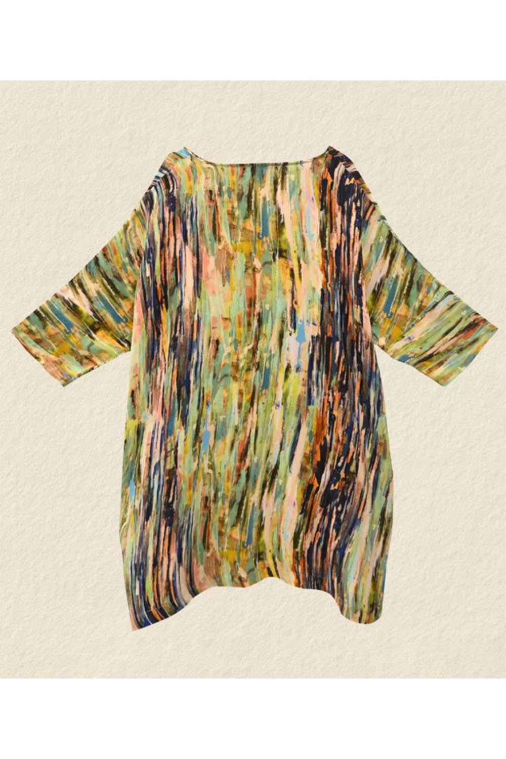 Jessie Juniper raga dress in draping viscose fabric. Multi coloured stripes digitally printed. Round neck. Loose, over sized style. Elbow length sleeves. Side pockets. Side splits.