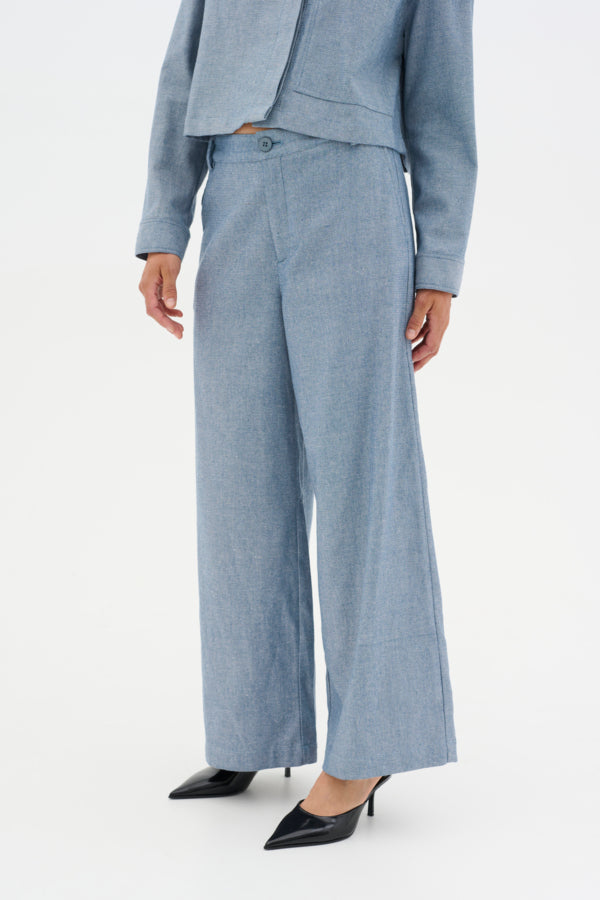 Jessie juniper My Essential wardrobe trousers in denim marl. Button and fly fastening. Belt loops. Side pockets. Back slot pockets. High waist. Wide legs.