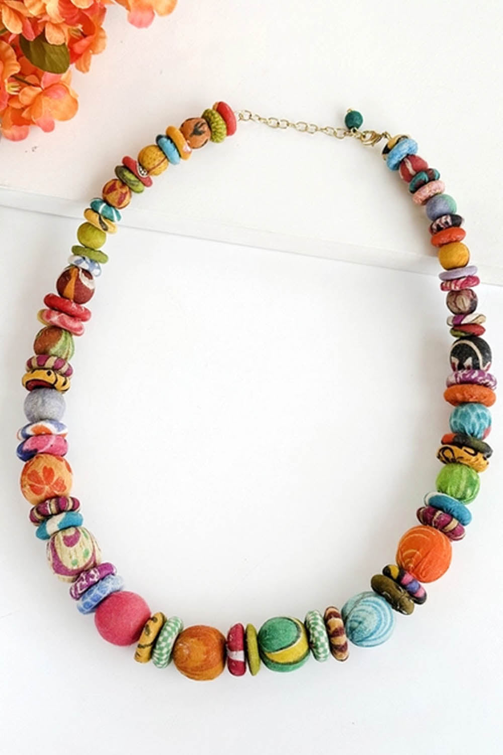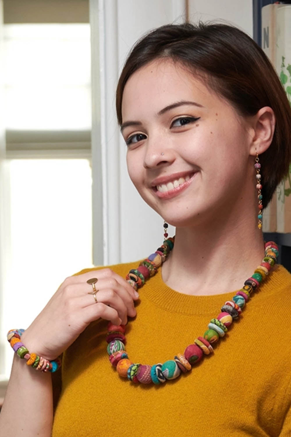 Crafted from repurposed Sari and Kantha fabric, the colorful beads are all one-of-a-kind.