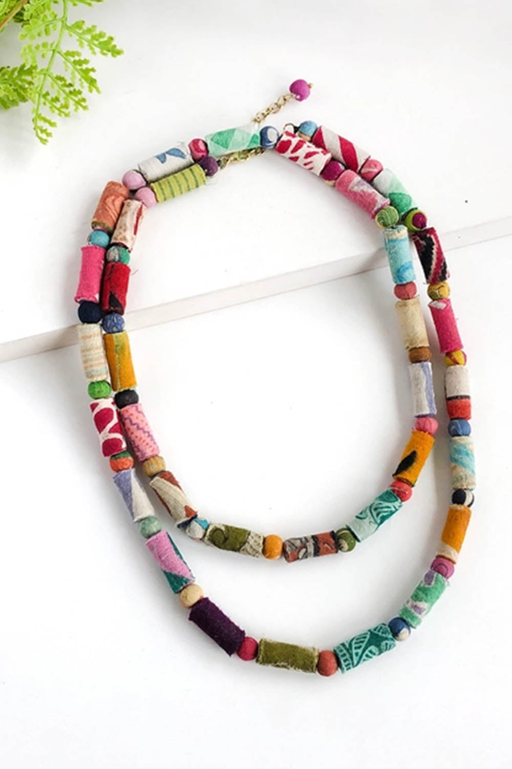 Round and tubular-shaped Kantha beads alternate to create this colorful, geometric style. This long strand is super versatile and can be worn singly, doubled or multi-wrapped as a bracelet