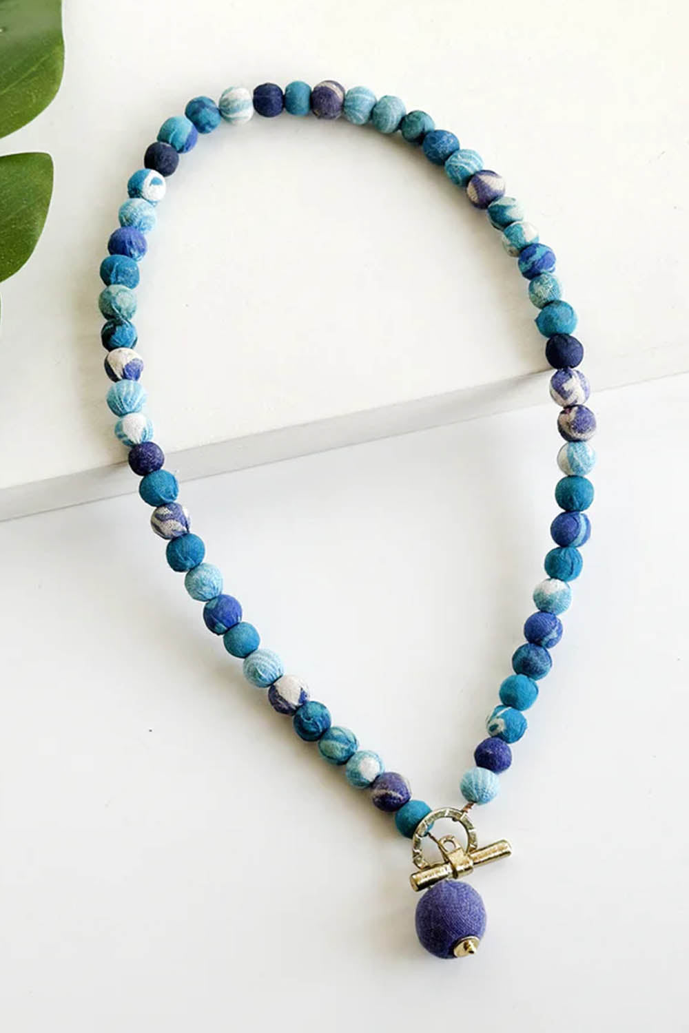 Jessie Juniper bead necklace with toggle fastening. A classic, colourful strand of Kantha is updated with a front toggle closure and a centre statement bead.