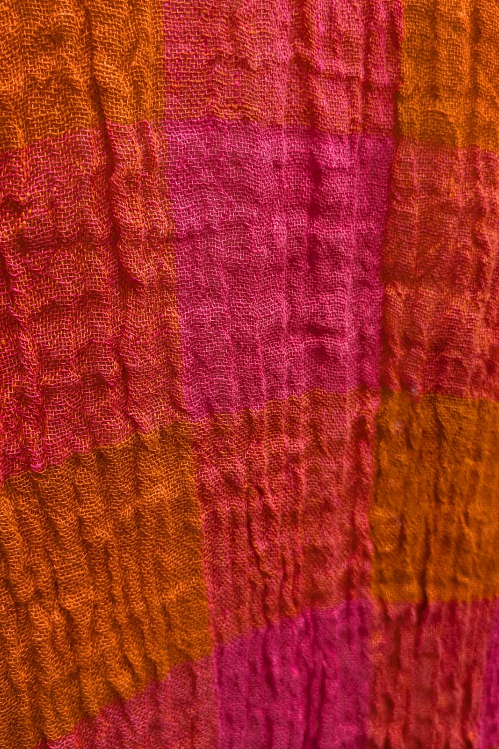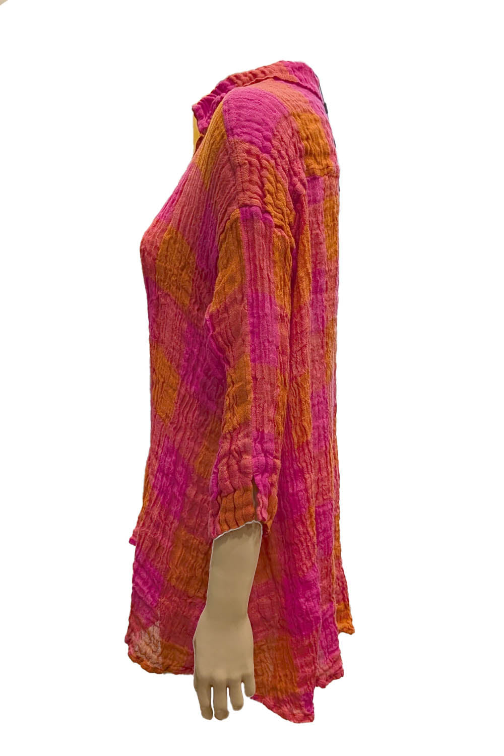 Jessie Juniper Grizas Large Check 51686 Linen Swing Shirt in ‘pink & flame’. Flattering A-line shaped shirt in crinkle textured linen. Features three-quarter length sleeve with dropped shoulder seam, longer, curved back hem, and coloured button fastening.