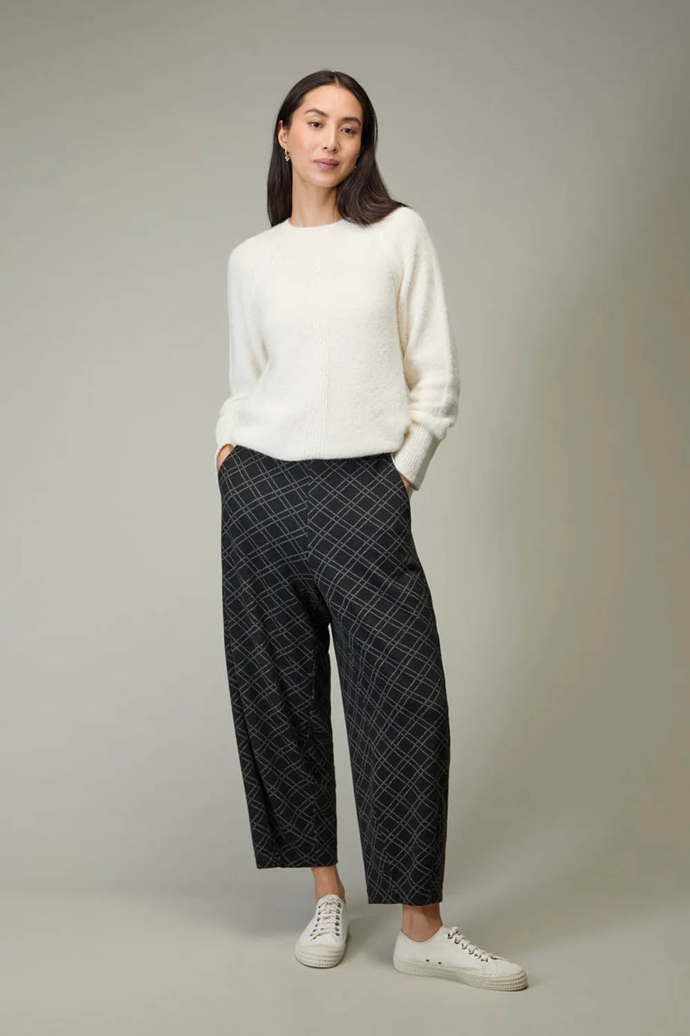 Jessie Juniper Sahara trousers in black with a grey grid check. High waist. Elasticated waistband. Side pockets. Barrel style leg. Super soft brushed jersey fabric.