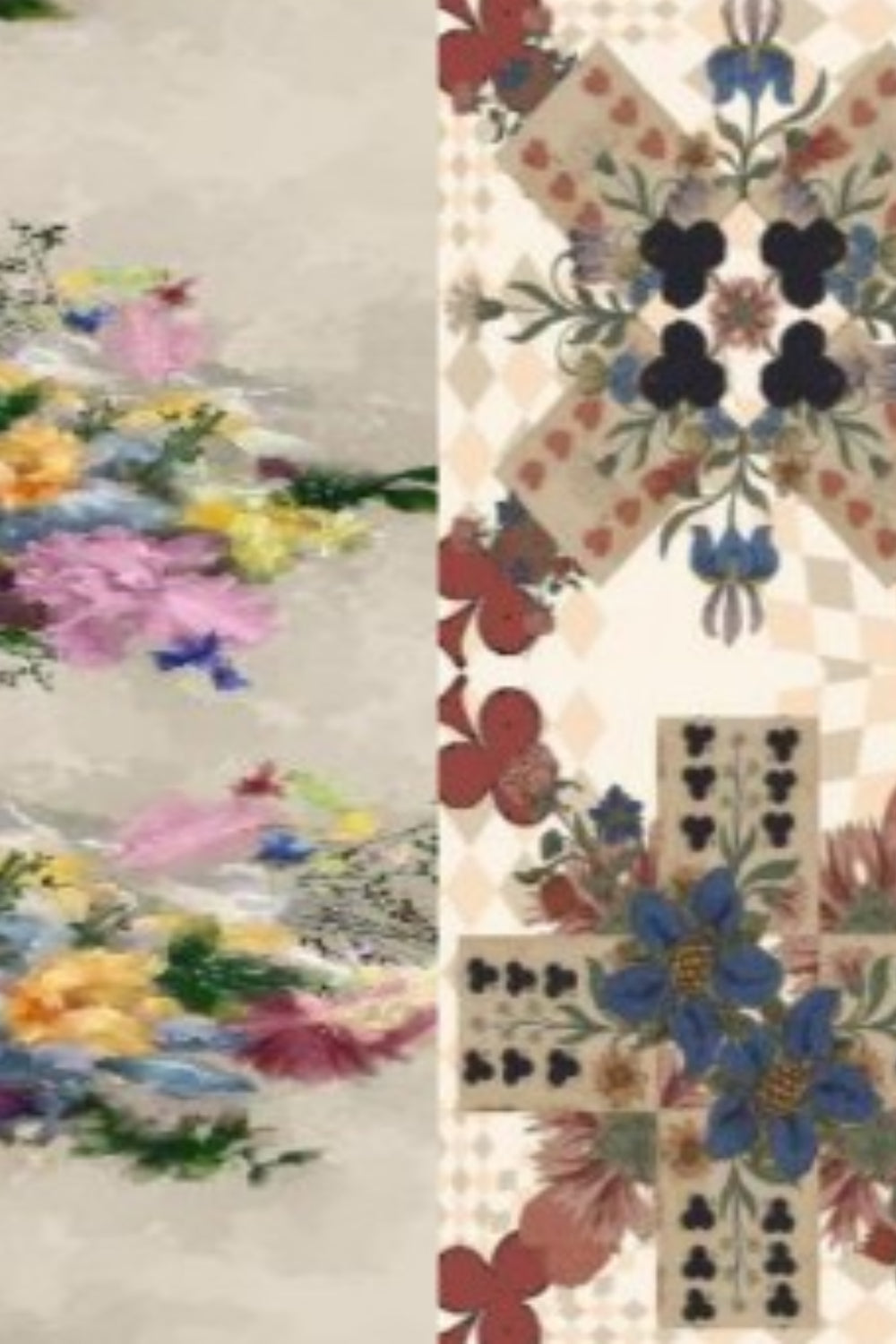 Jessie Juniper Yavi jacket in 2 fabrics. Fully reversible with pockets on each side. Linen one side in mottled cream with an abstract floral print in yellows, pinks, greens and blues. The other side is cotton with an abstract playing card design in cream with red, blue and black.