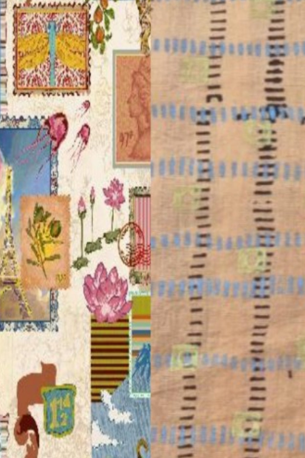Jessie Juniper Yavi jacket in 2 fabrics. Fully reversible with pockets on both sides.Linen one side in cream with a colourful abstract stamp design, with travel destination illustrations. The other side is light brown with a grid design in brown, blue and green. 3/4 length sleeves. Edge to edge style.