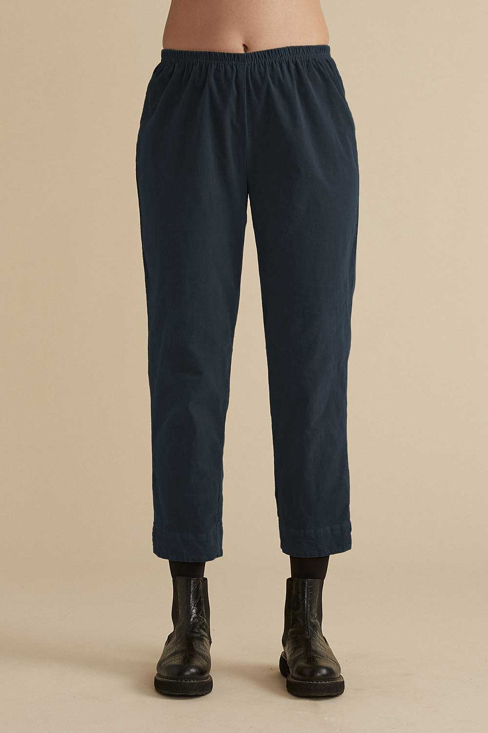 Jessie Juniper Cut Loose trousers in fine needlecord. High waist. Elasticated waistband. Cropped length slim leg style. Deep hem with side split.