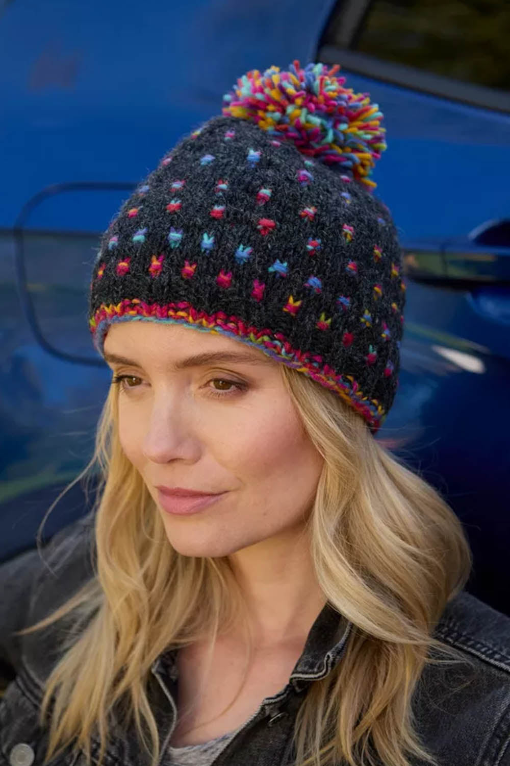 Jessie Juniper Pachamama Mosaic Bobble Beanie in grey. Chunky wool knit hat with vibrant coloured pom-pom bobble, and fleece band to inside for warmth and comfort.