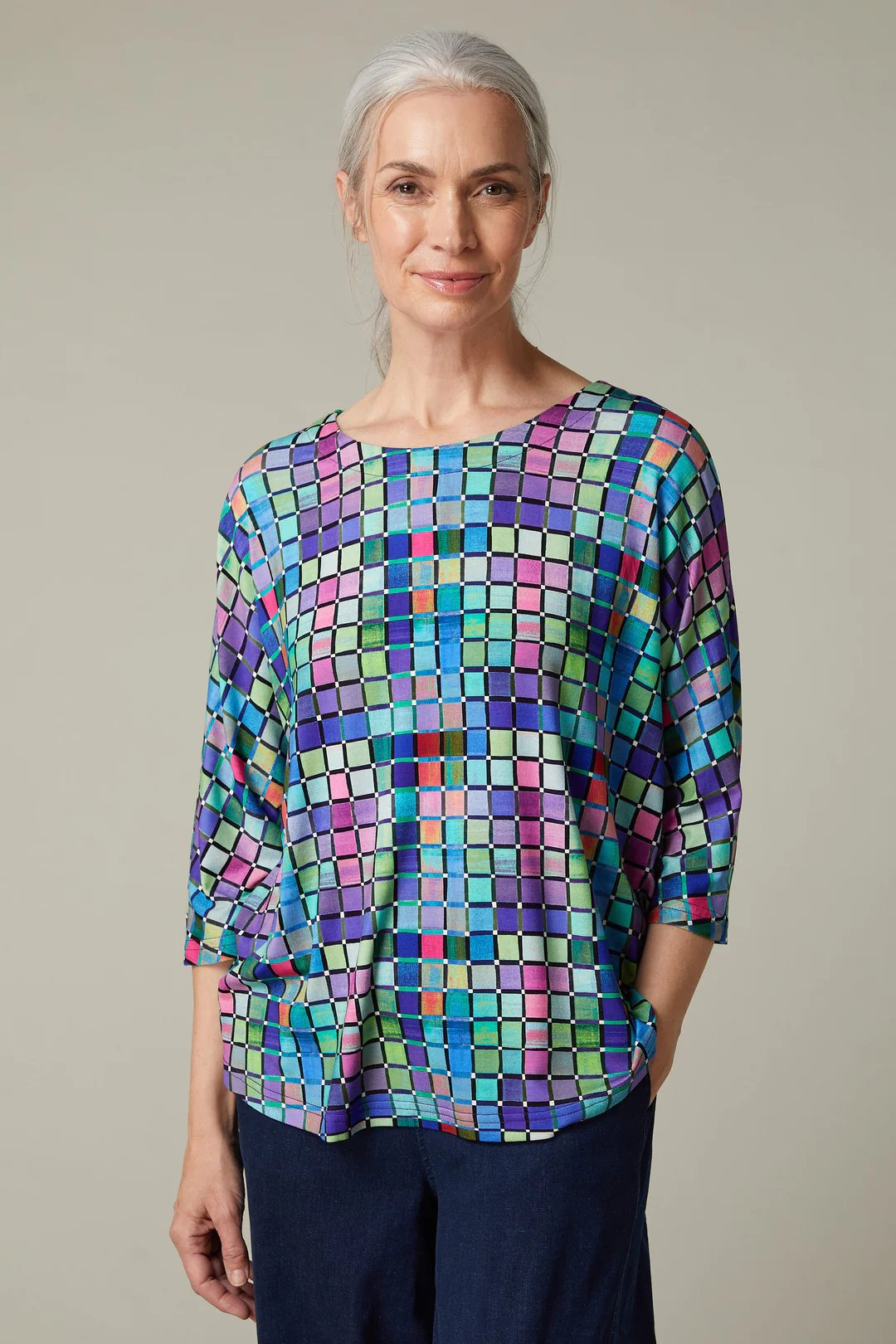 Jessie Juniper Sahara top in a bright print of multi coloured squares. Round neck. 3/4 length sleeves. Loose fit, draping at the sides. Soft eco viscose fabric.