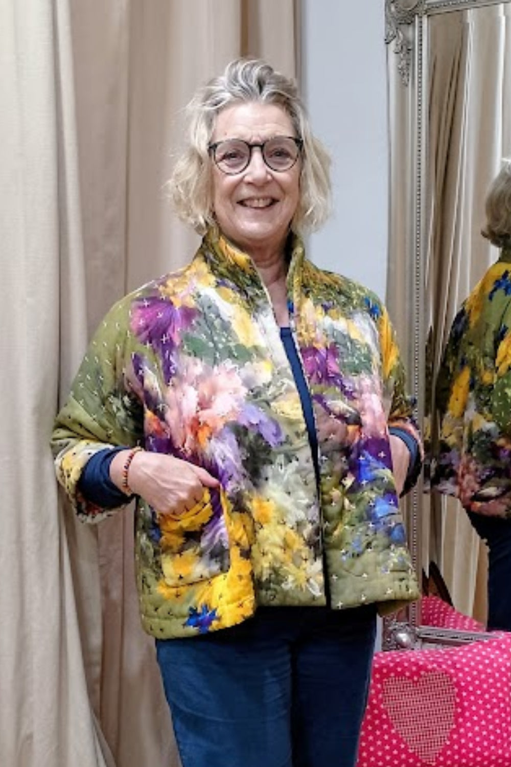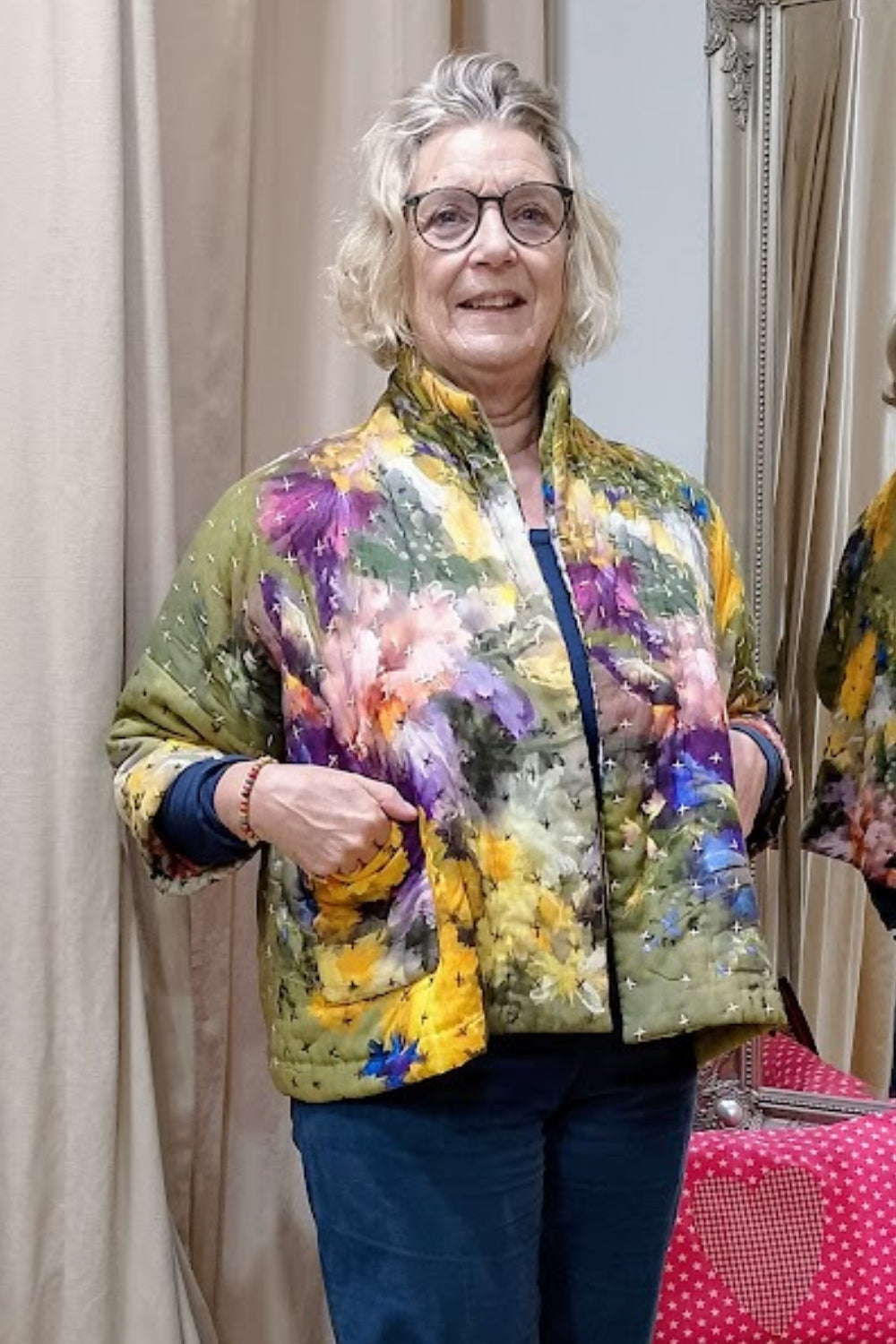 Jessie Juniper Yavi jacket in a boxy style. Inside is lined in green cotton with a red stripe. The outer is quilted in shades of green, pinks, yellow and purple with embroidered detail. Edge to edge style. Patch pockets. 3/4 length sleeves.