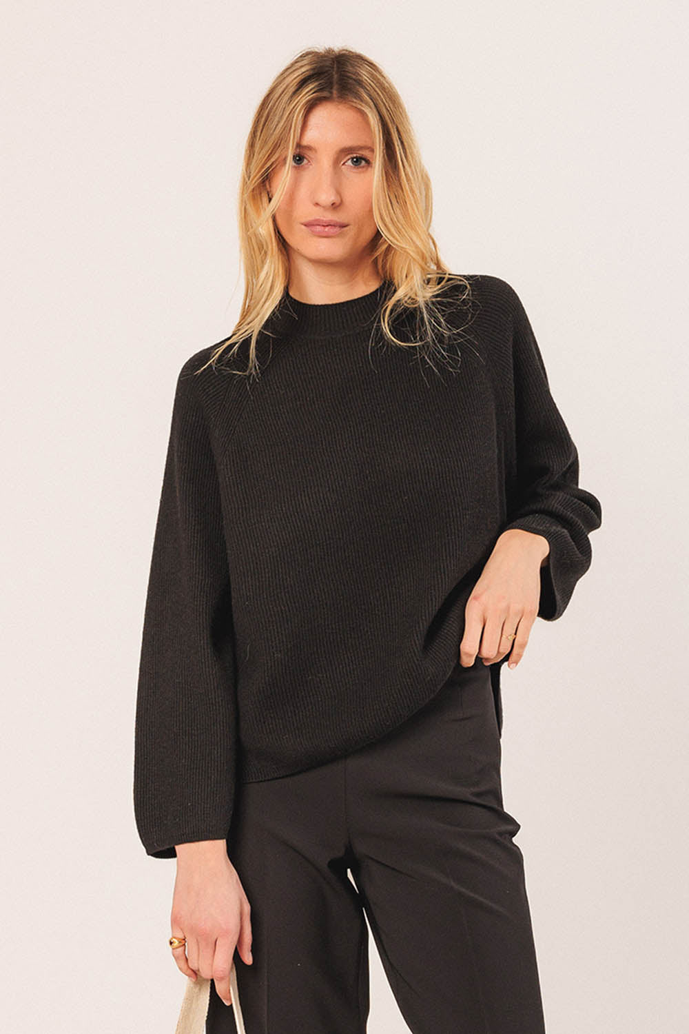 Jessie Juniper Indi & Cold sweater in black. Rib knit. Crew neck. Loose fit. Loose 3/4 length sleeves. Side splits from hem.