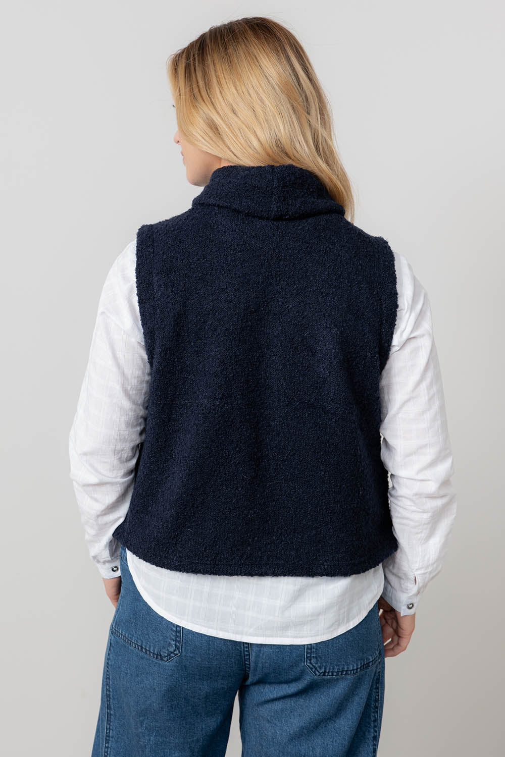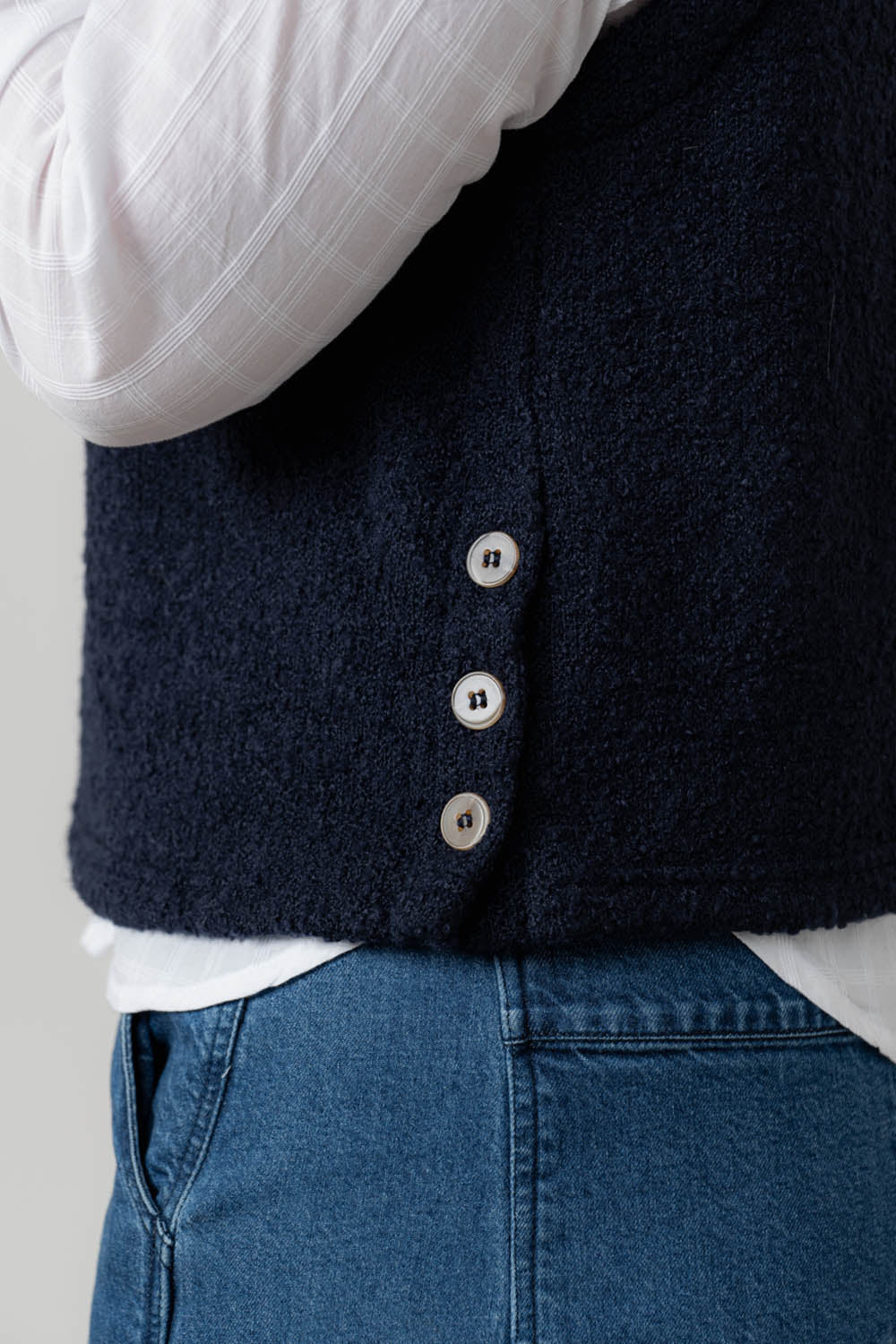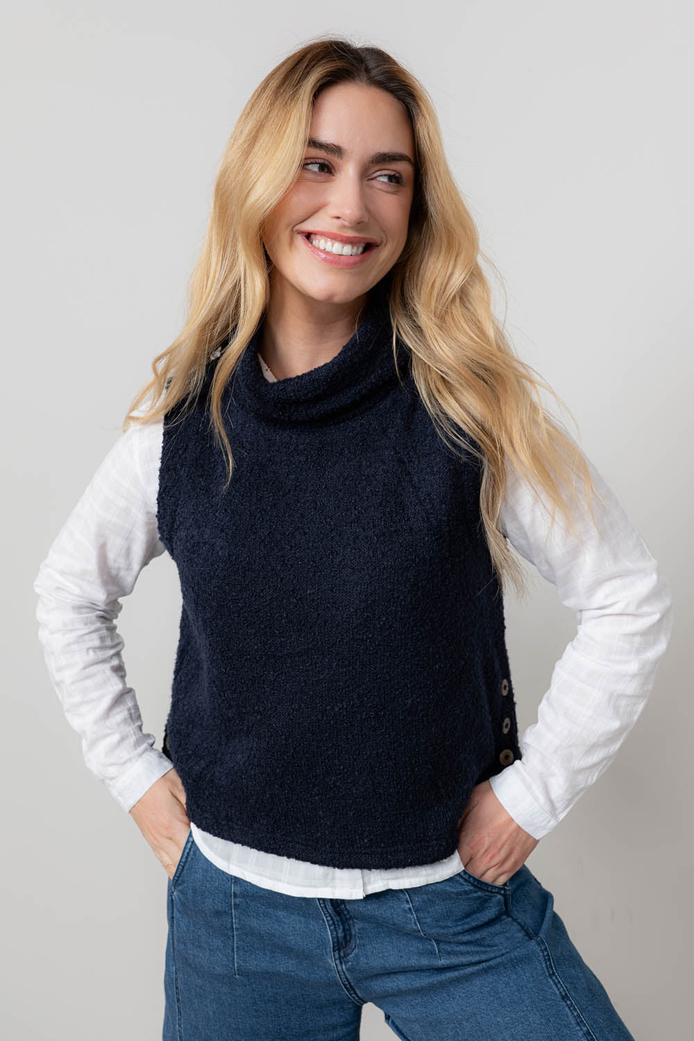 Jessie Juniper Lily & Me tank top in navy blue. Cowl neck. Sleeveless. 3 buttons on each side. Boucle jersey fabric.