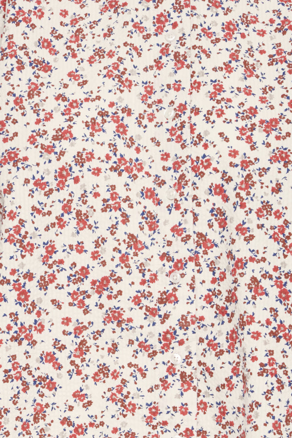 Jessie Juniper Ichi shirt in woven cotton. Cream background with a navy and red ditsy flower print. High neck with small ruffle. Wrist length full sleeves with single button cuff. Front buttons to fasten.