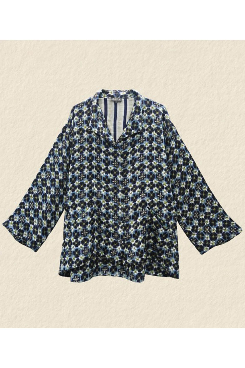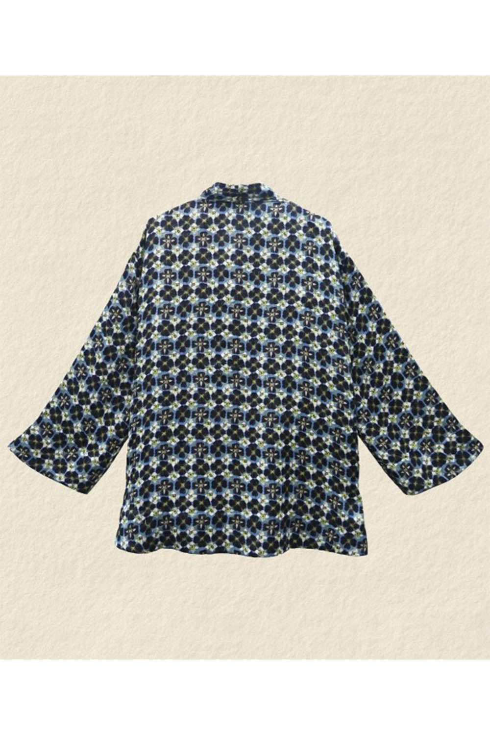 Jessie Juniper RAGA jacket in a blue, green, cream and navy pansy print. Fully reversible, the alternative is navy, cream and beige stripes. Wooden buttons showing on pansy side. Slot pockets at an angle. Vertical over stitching. Soft, silky fabric. Full length sleeves. Longer length at the back.