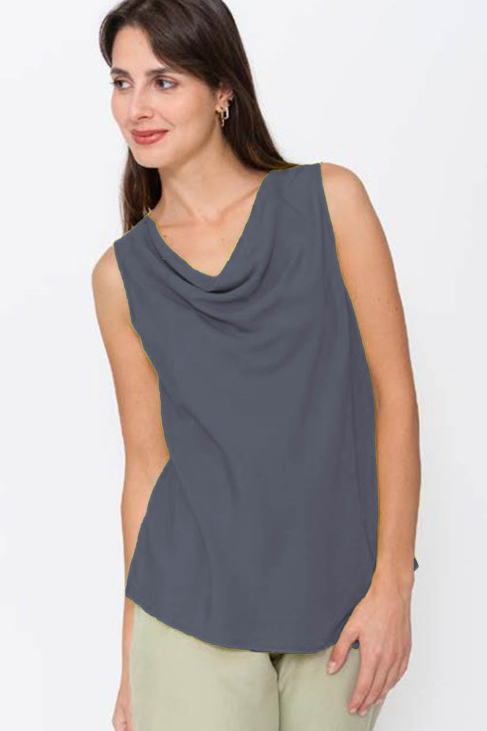 Jessie Juniper Sleeveless Top, available in ‘navy’, ‘lime green’ and ‘peacock’. Sleeveless top in silky-soft fabric. Cowl neck and asymmetrical cross-over front with pointed hem detail.