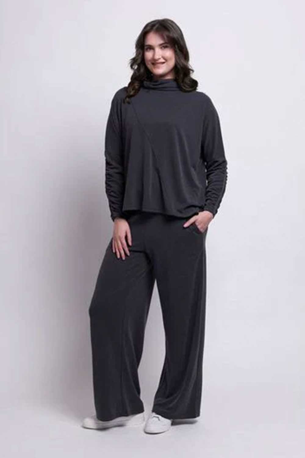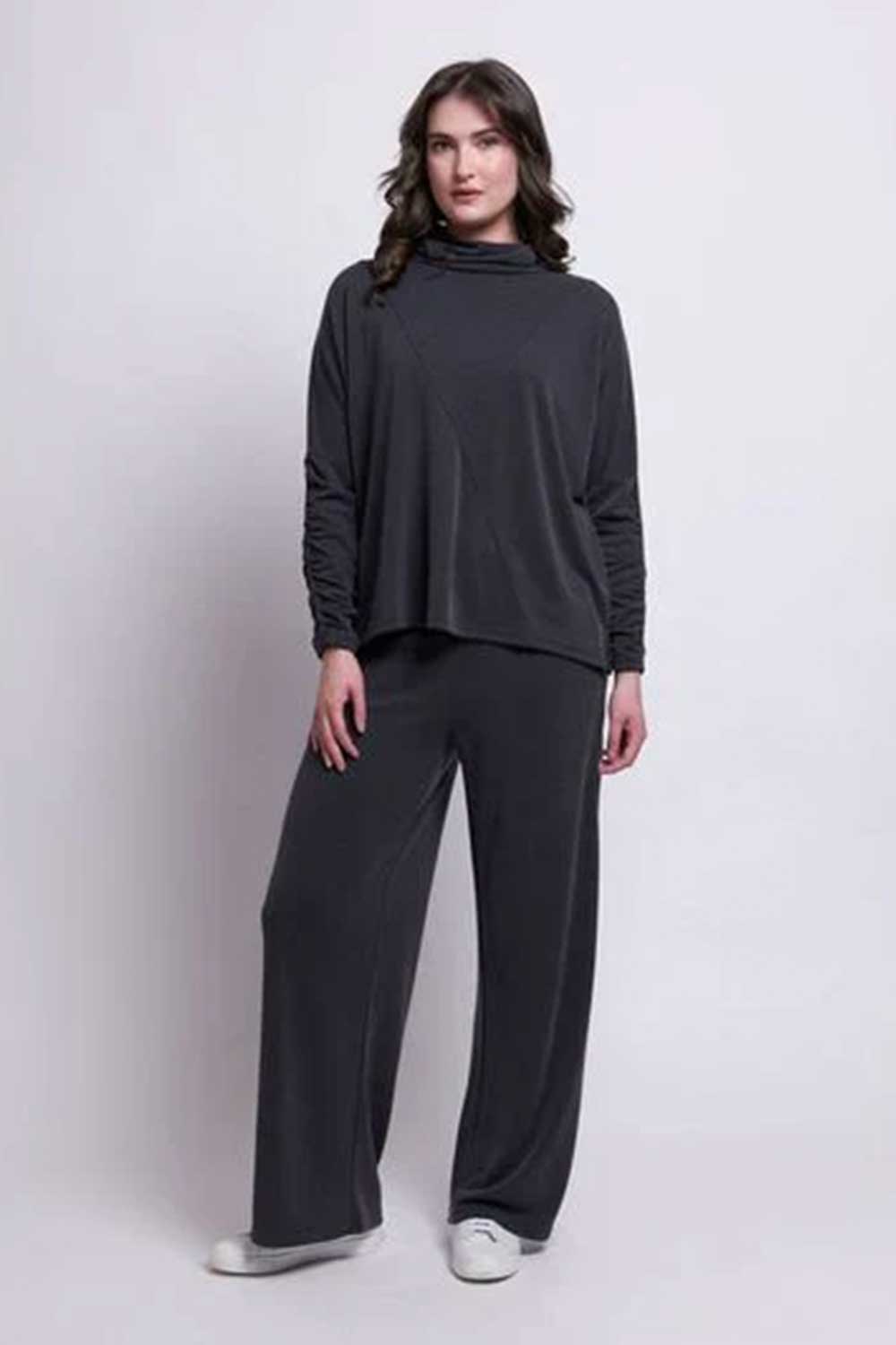 Jessie Juniper Foil trousers in soft, grey jersey. Thick, elasticated waist with soft gathers. Wide legs. Side pockets. Draping fabric.