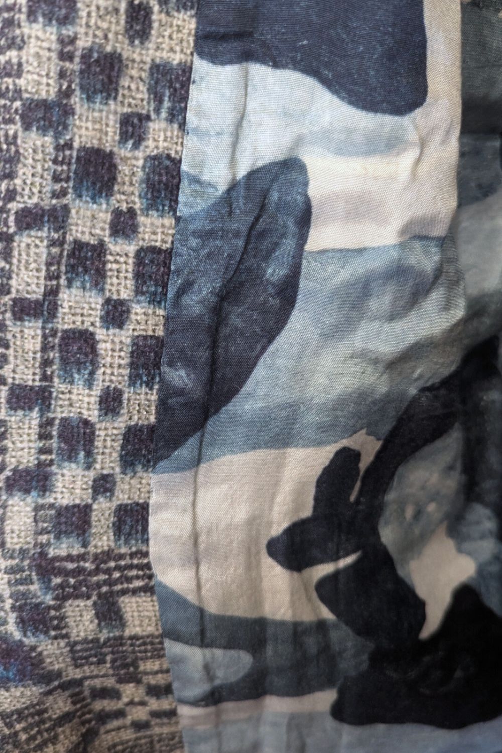 Jessie Juniper Raga jacket in shades of blue and grey. Abstract squares print. Woven cotton outer. Fully lined in a blues floral print. Kimono style. Front patch pockets. Full length sleeves. Over sized style.