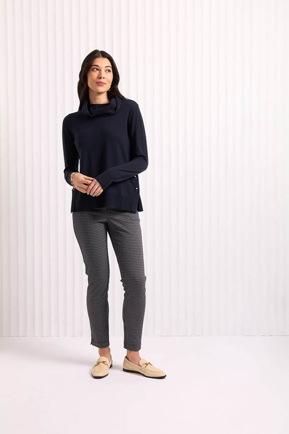 Jessie Juniper Foil trousers in a subtle check. Navy, grey and cream check. Soft stretch jersey fabric. High waist. Popper, button and zip fastening. Side pockets. Elastic at back of waist. Faux pockets at back. Slim leg style.