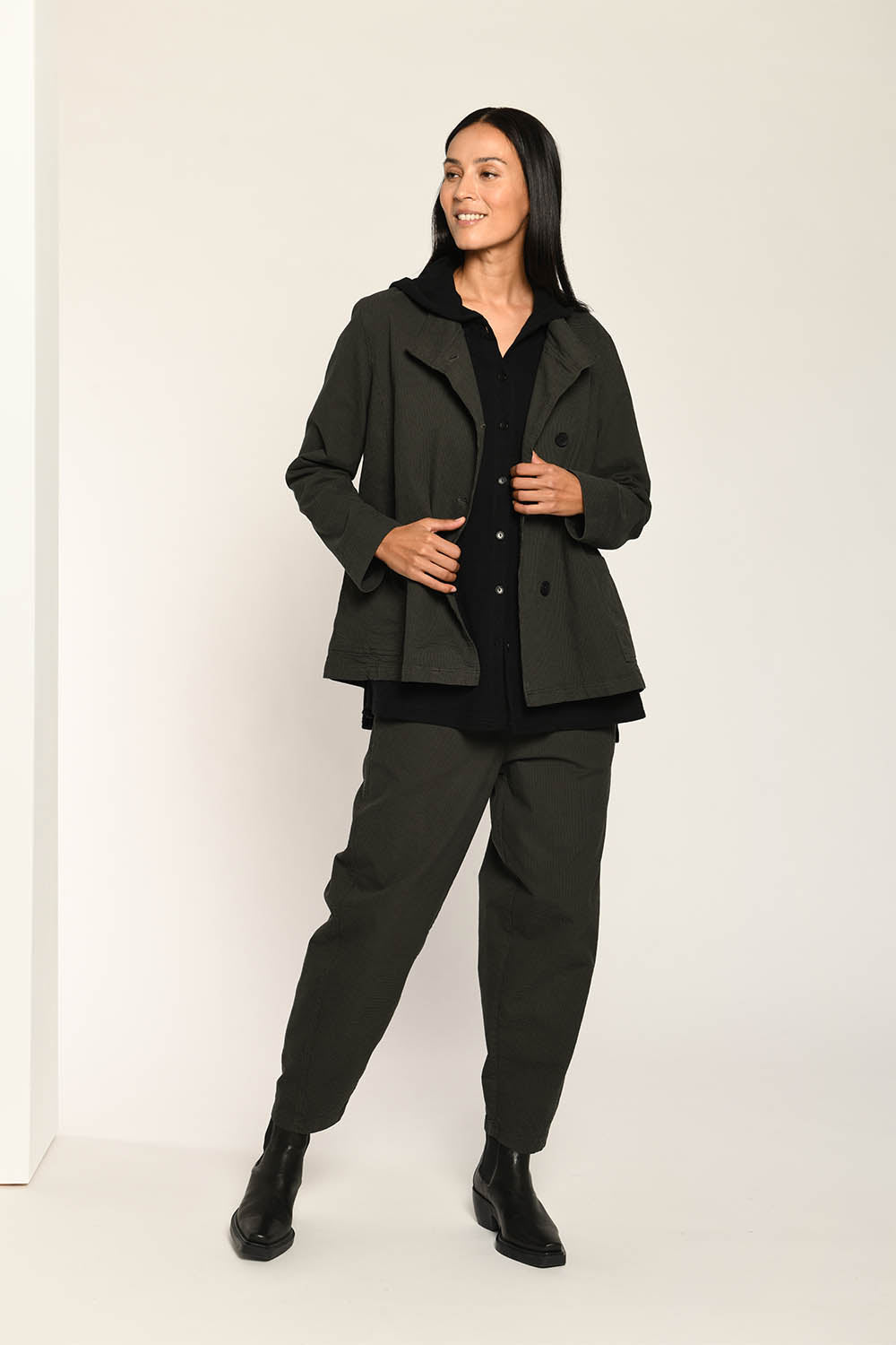 Jessie Juniper Vetono jacket in an olive green and black micro check. Soft cotton fabric. Crew style neckline set off centre with buttons through. A line style. 2 patch pockets at a slant. Full length sleeves. Cross over split on back.