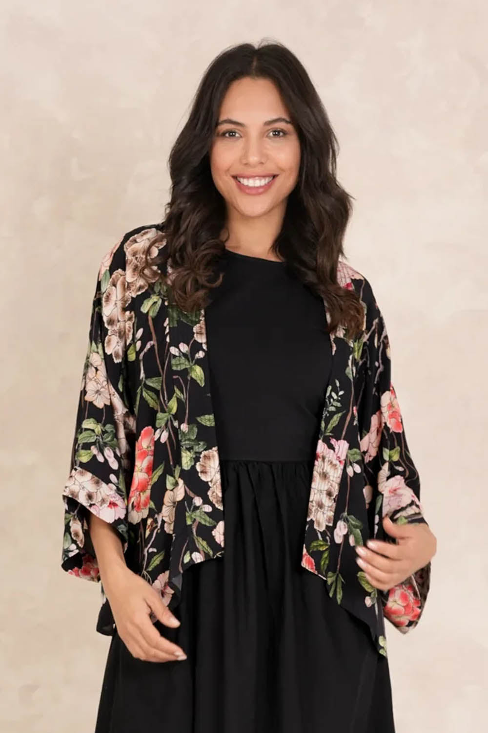 Our bestselling kimono jackets have loose ¾ length sleeves, an open front and a lightly embroidered lapel. The crepe Kimono is a heavier weight than our classic kimono. Pair with a matching camisole and your favourite jeans in summer or layer over a polo neck during the cooler months.