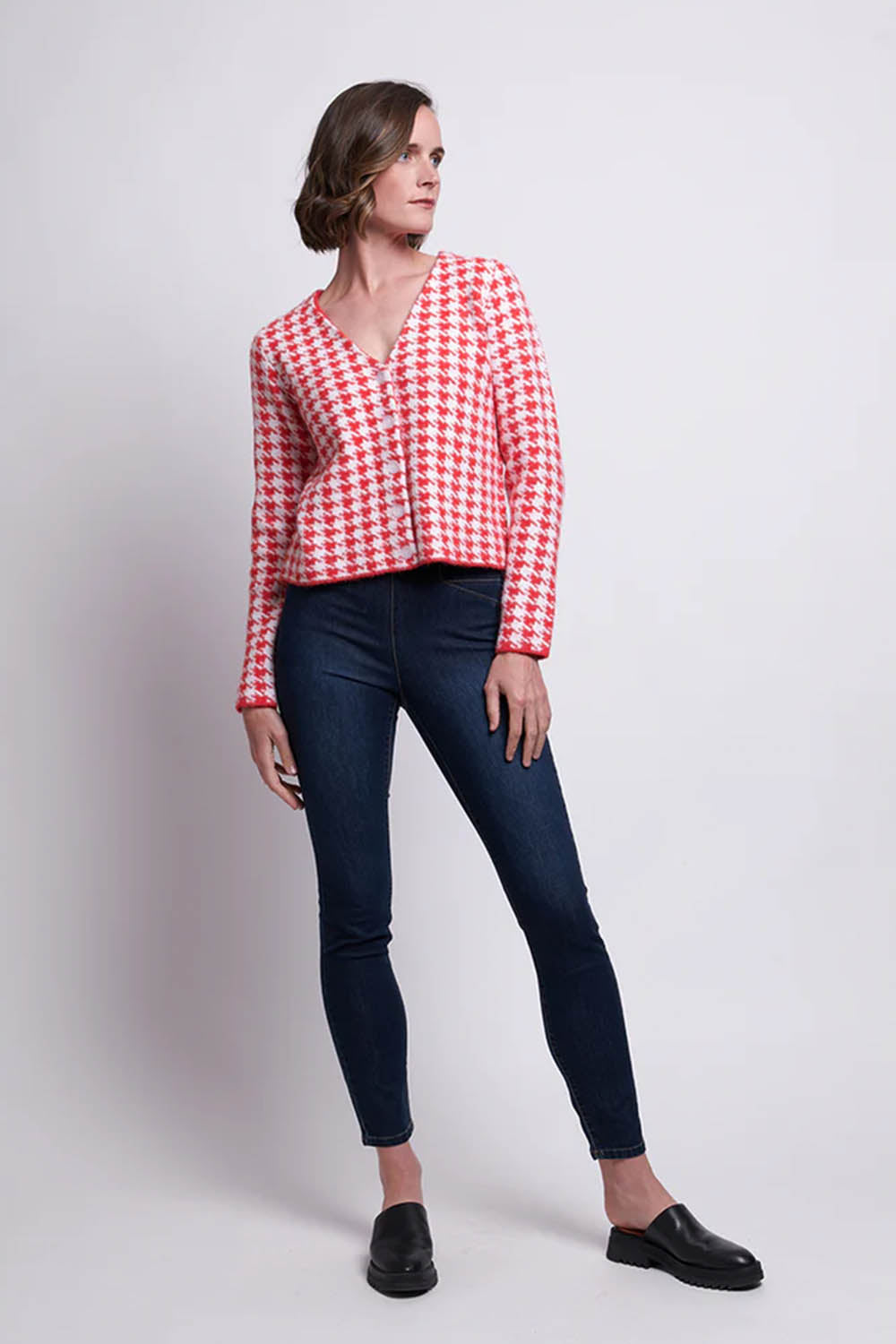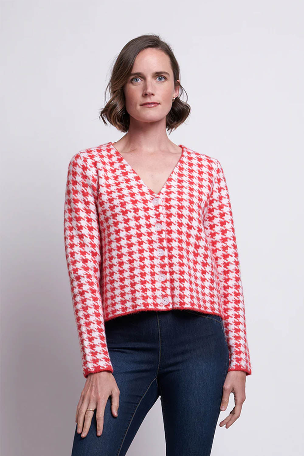 Jessie Juniper Foil cardigan in a red and white combination and a beige and white combination. V neckline. Buttons through. Full length sleeves. Jacquard design. Thick, cosy knit.