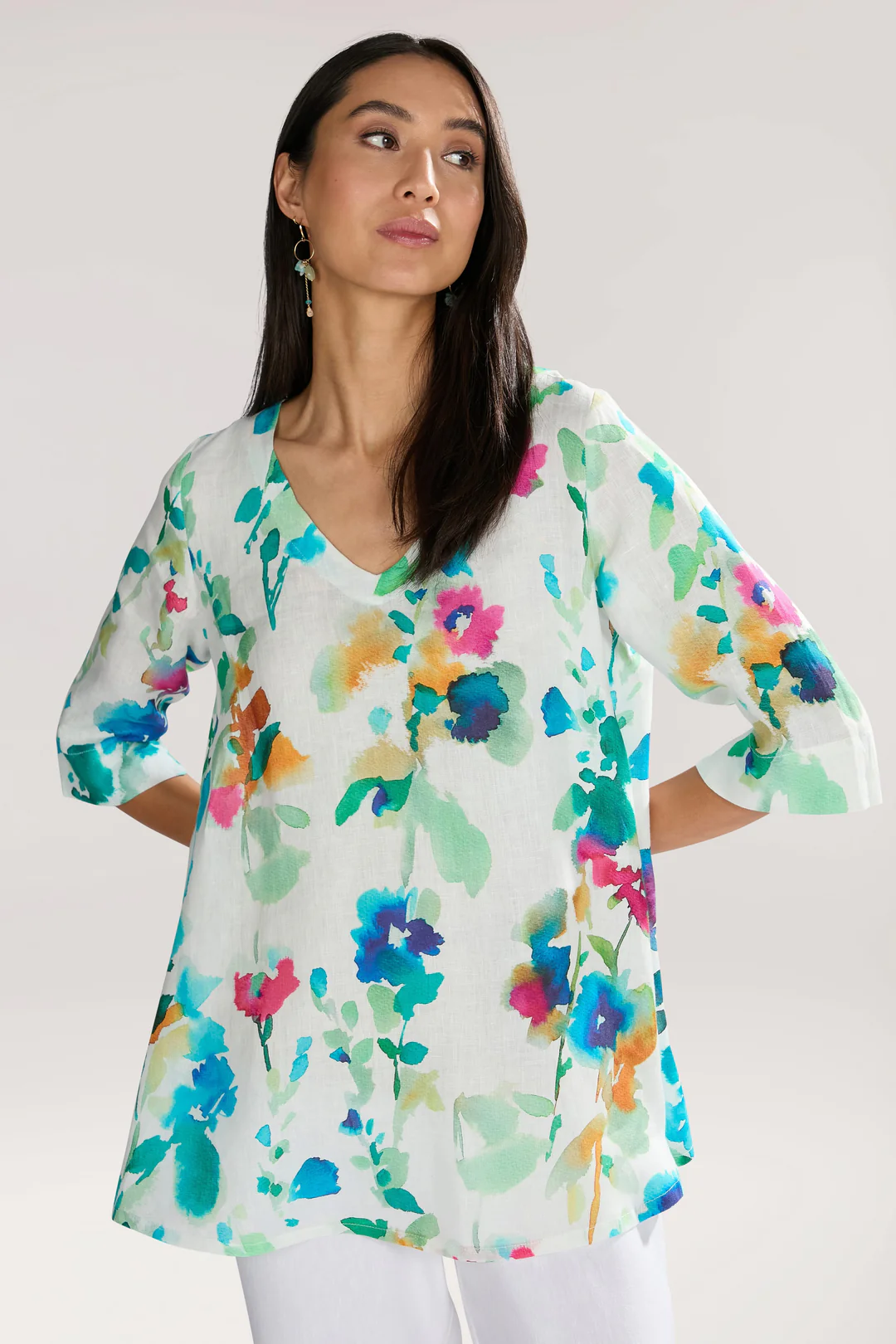 Jessie Juniper Sahara tunic in white linen with an abstract floral print. V neck. 3/4 length sleeves. A line style.