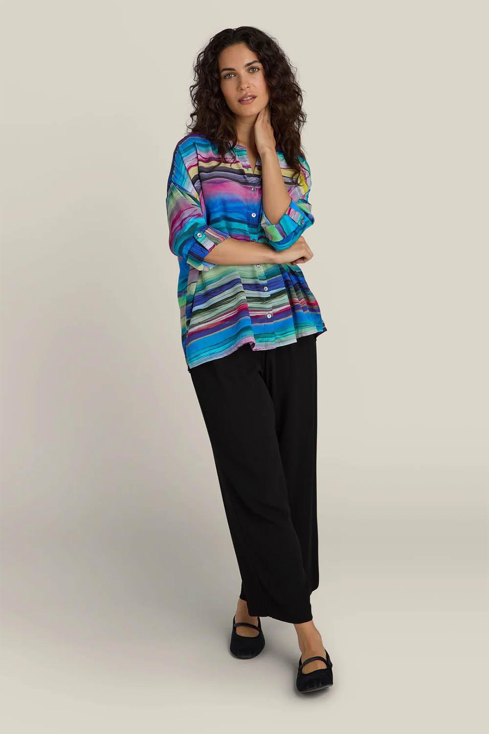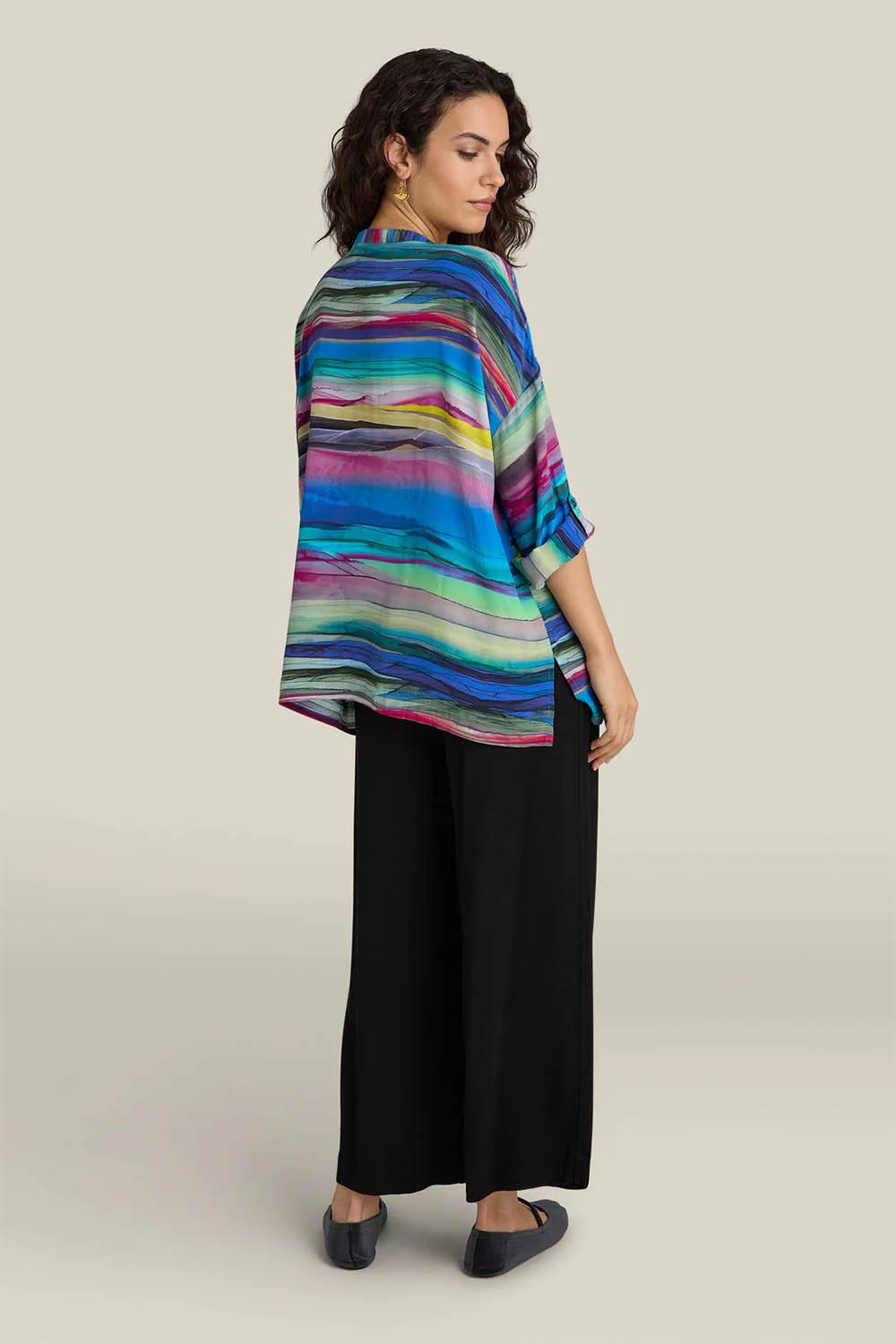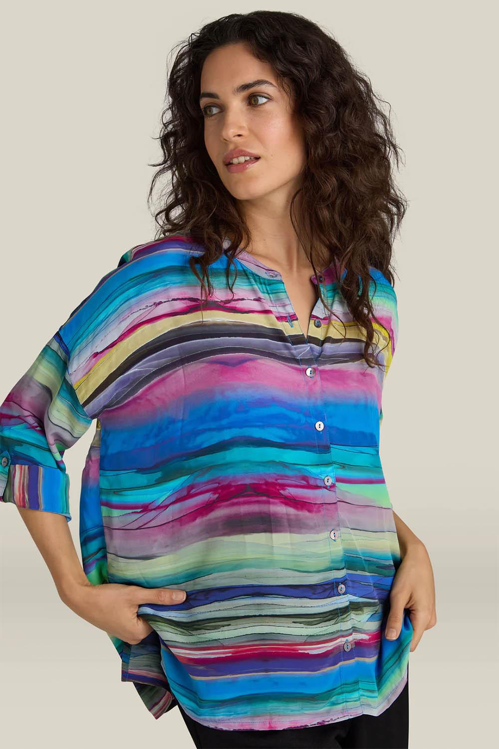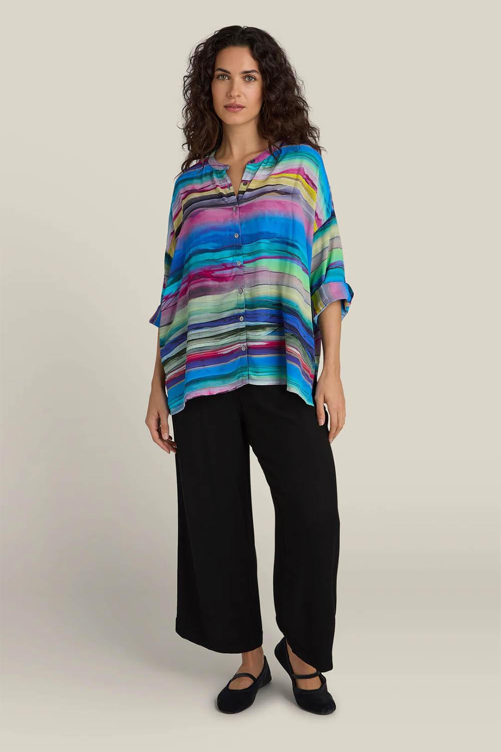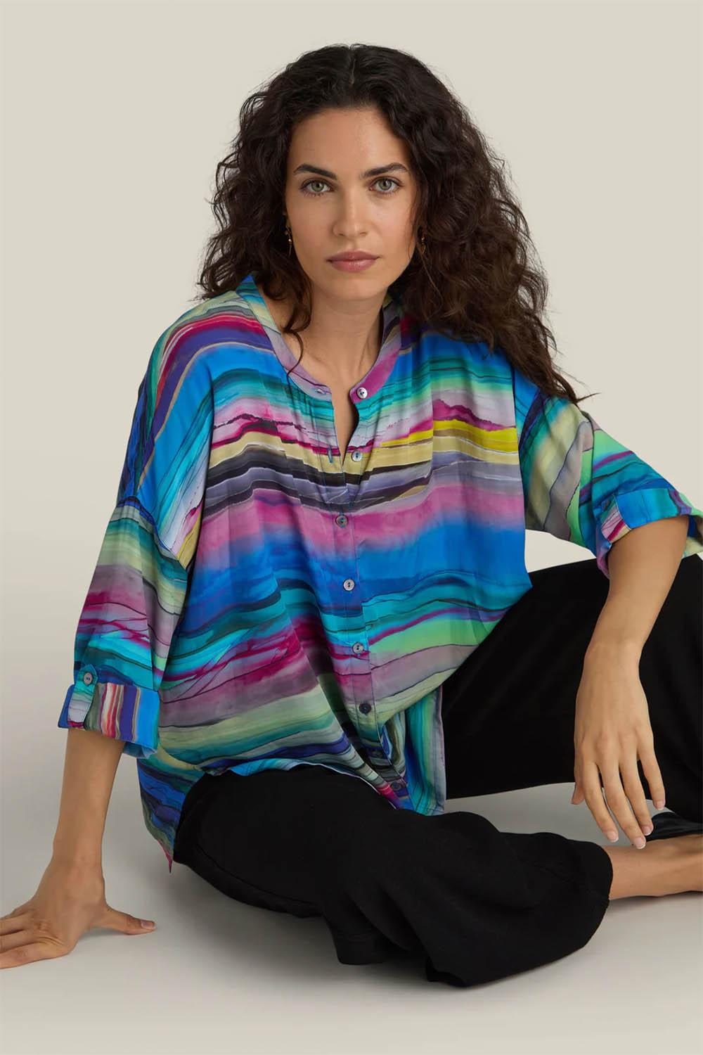 Jessie Juniper Watercolour Landscape Boxy Shirt. Silky-soft fabric with stunning watercolour print. Loose, A-line cut, for a comfortable, flattering fit.Three-quarter length sleeve with tab and button detail. Collarless style with side vents, and paua shell button fastening. Teamed with Sahara’s Pinwale Cord Bubble Trouser, this stunning shirt will be a wardrobe favourite for seasons to come!
